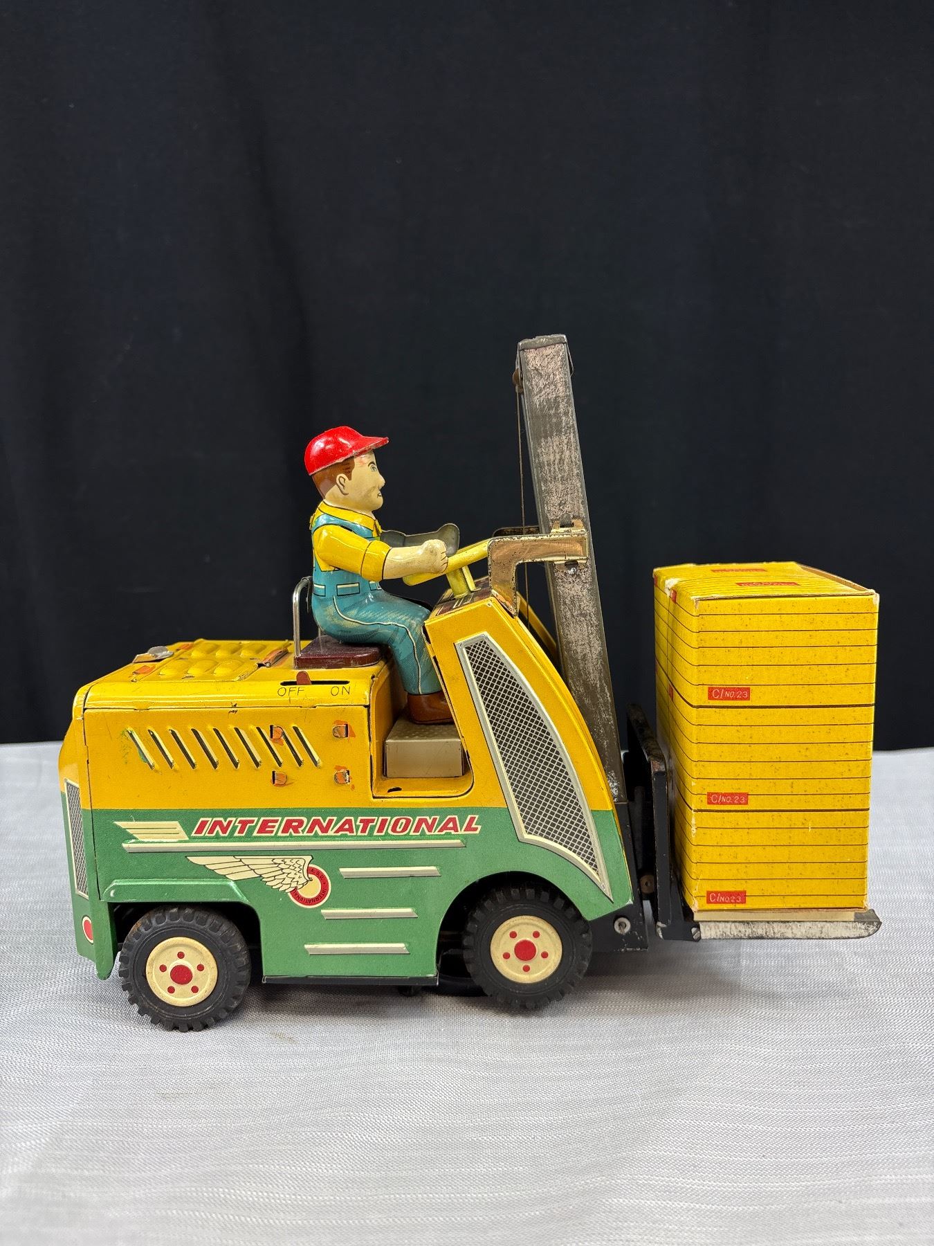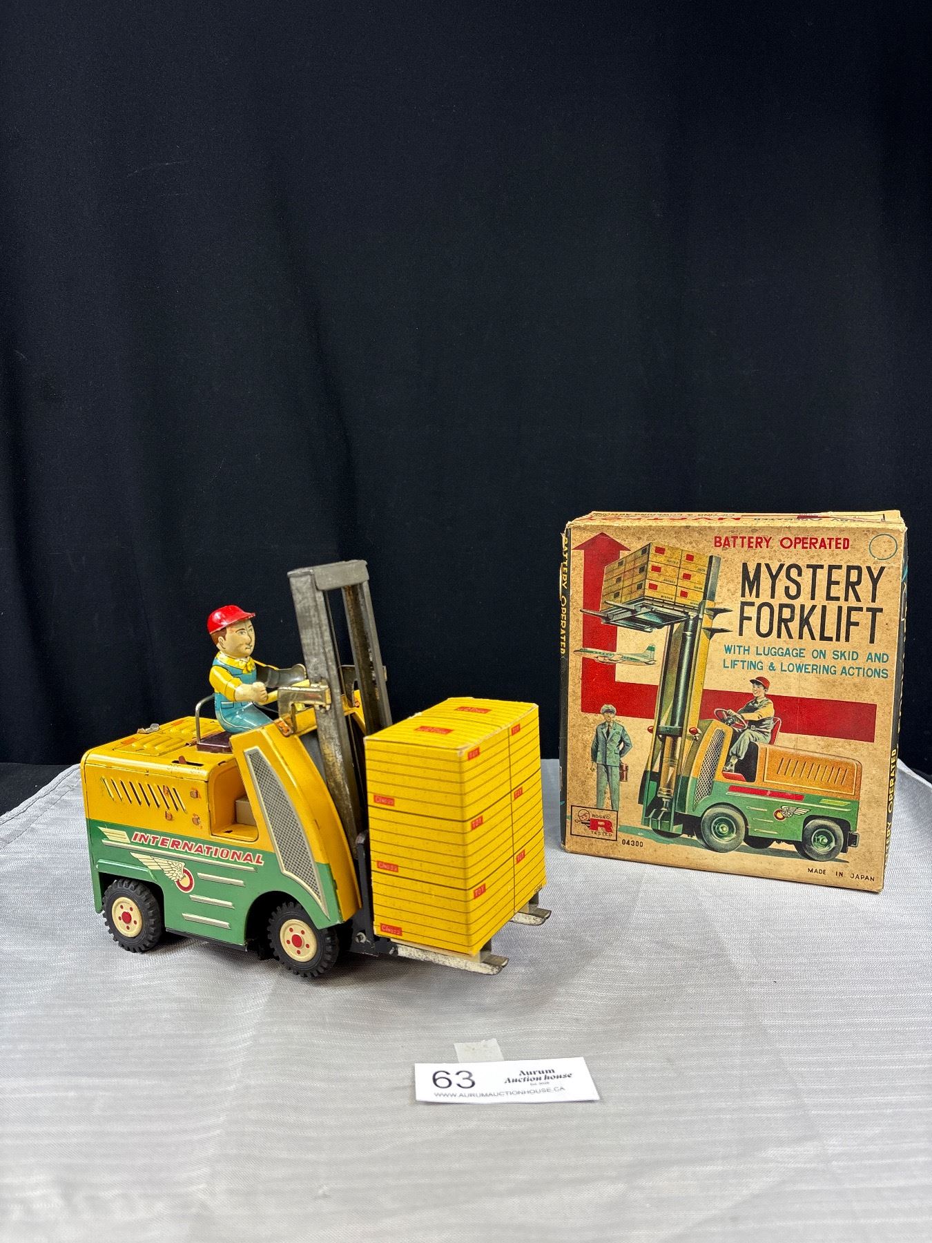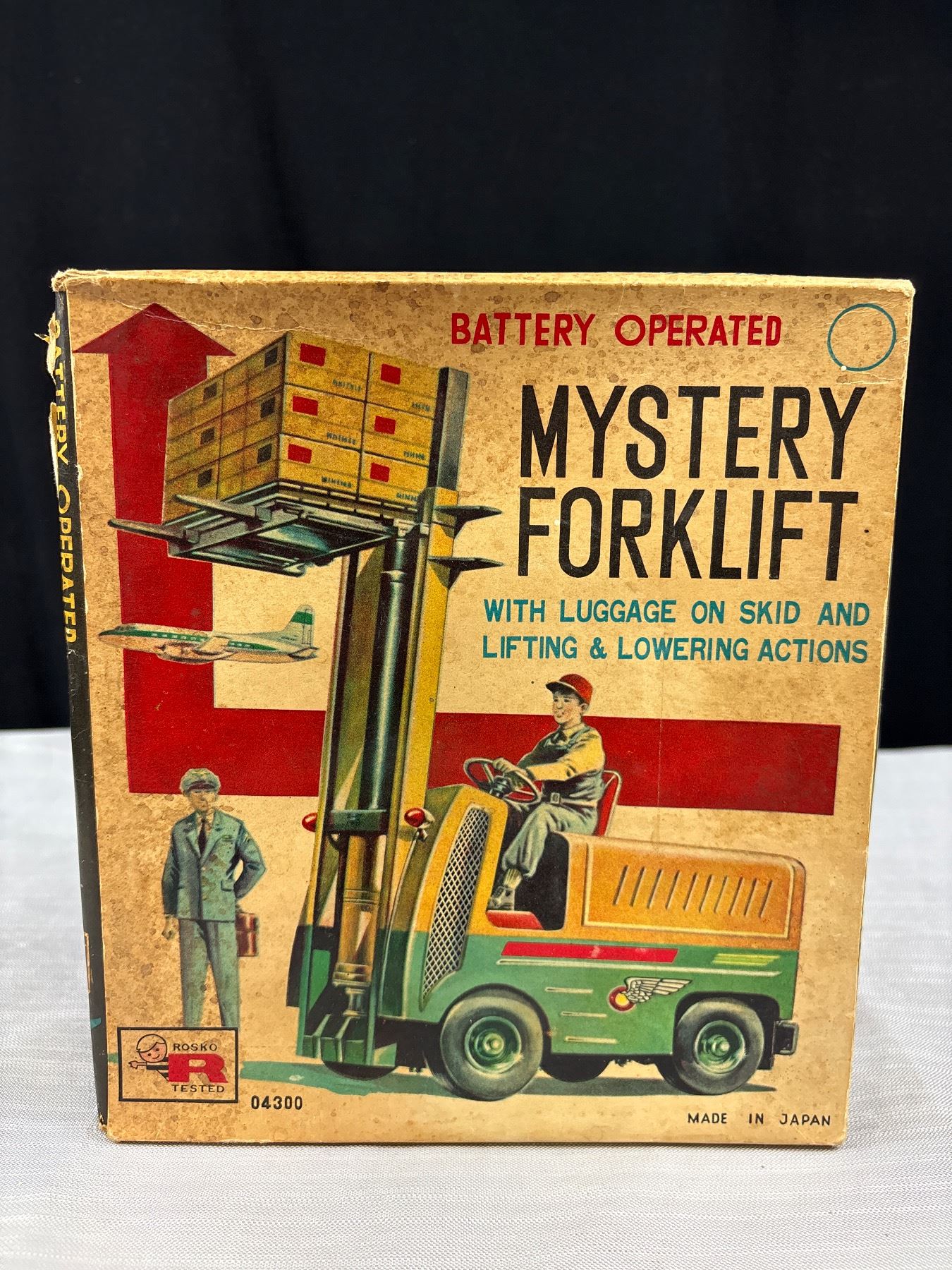 Vintage Made in Japan Mystery Fork Lift w/ Original Box Great Graphics and Condition