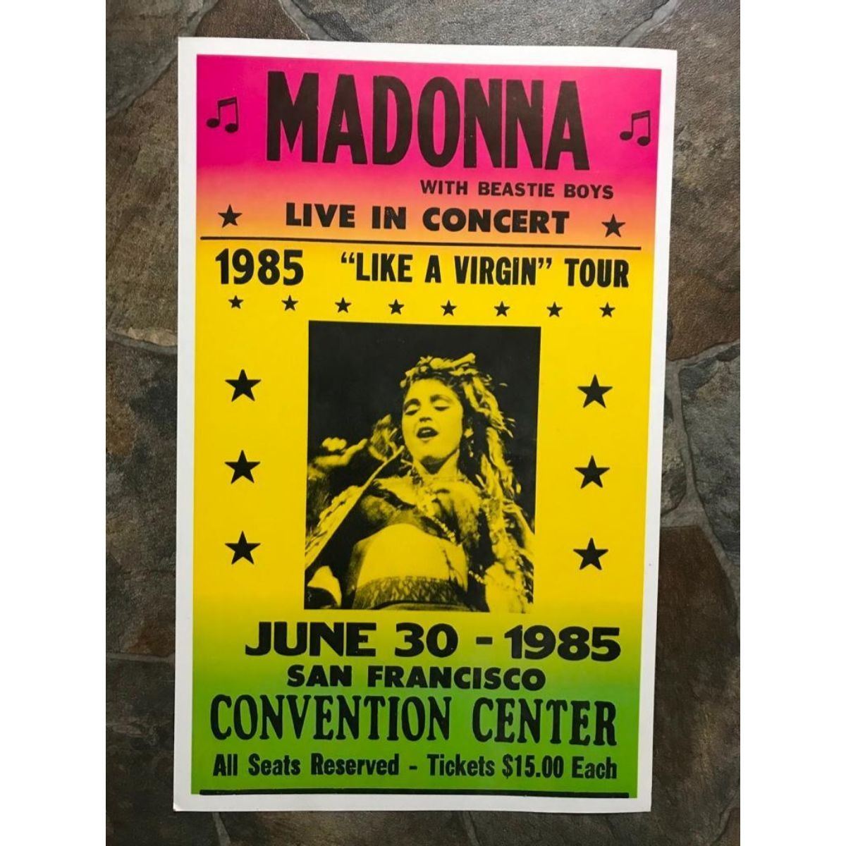 Madonna concert poster, vintage creation from the late 1980's - early 1990's, a recreation of an original from her 1985 "Like A Virgin" tour, San Francisco Convention Center. 14" X 22" printed on cardboard.Â