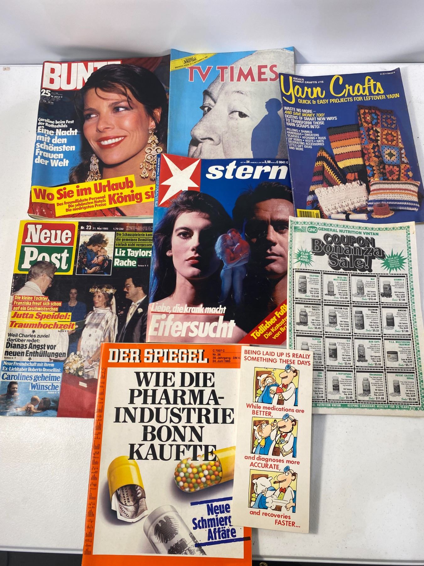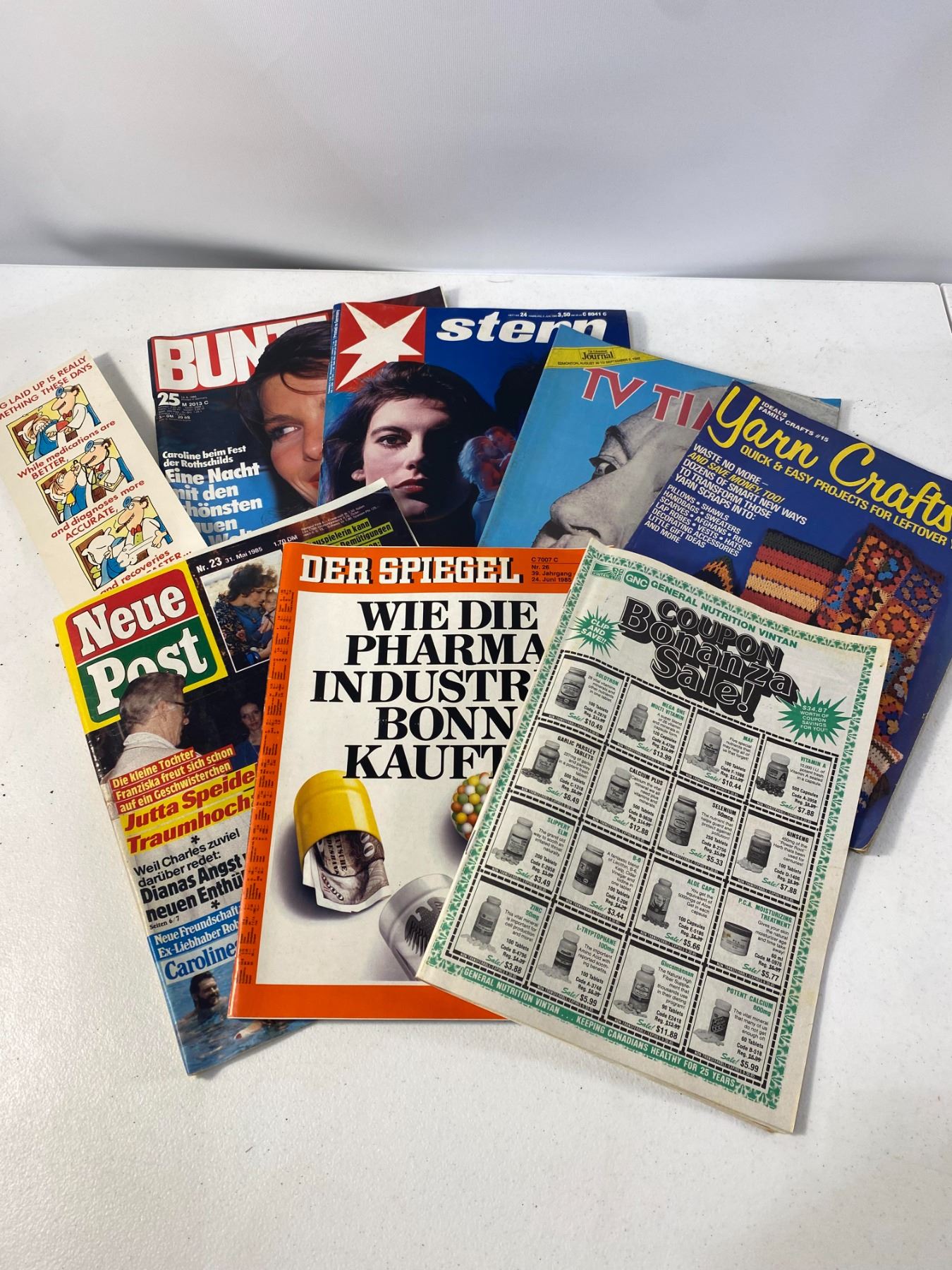 Assorted vintage magazines including German titles, craft booklet, coupons, and booklet. Approx. 1970s 1980s. Condition: typical age wear.