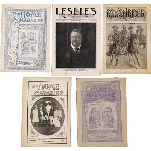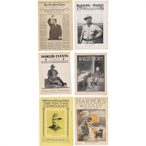 <B>Lot of Vintage Magazines with Teddy Roosevelt Covers.</B></I> A group of nine period magazines including an April 7, 1904 issue of <I>Leslie's Weekly,</B></I> September 24, 1898 and July 20, 1912 editions of <I>Harper's Weekly,</B></I> a January 12, 1919 edition of the <I>New York Times</B></I> magazine section, September 1, 1898 copy of <I>The Youth's Companion,</B></I> August, 1904 and May, 1905 editions of "<I>World's Events,</B></I> April, September, and October, 1901 <I>The Home Magazine,</B></I> all complete and in very good condition.<BR><BR><b>Shipping:</b> Large Flat (<a target="_blank" href="http://www.heritageauctions.com/common/shipping.php">view shipping information</a>)
