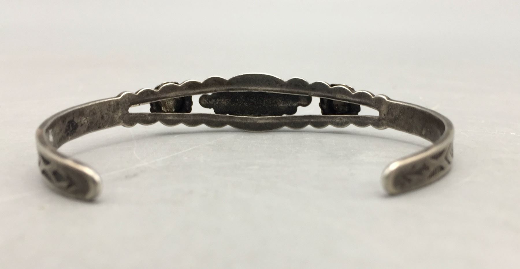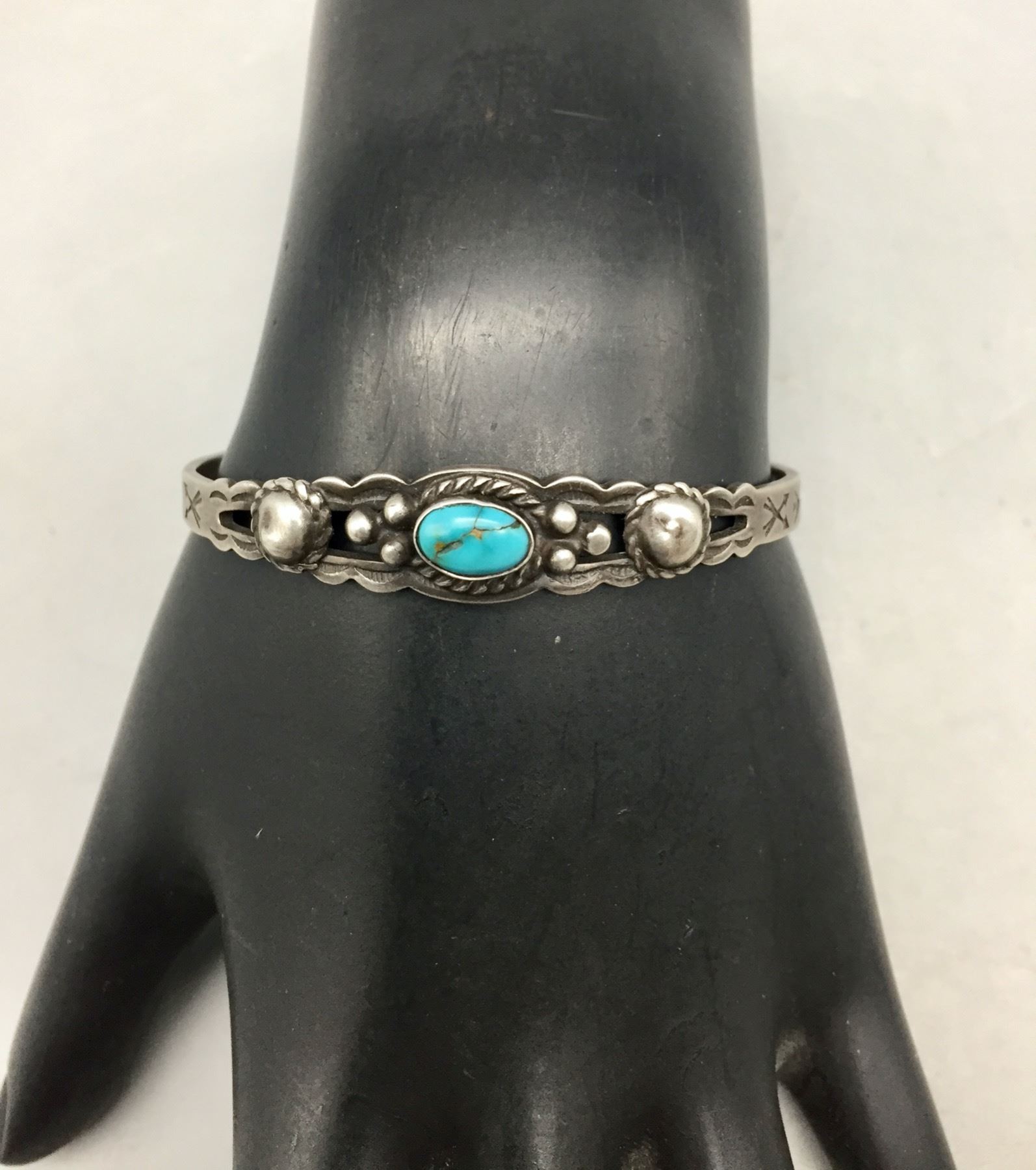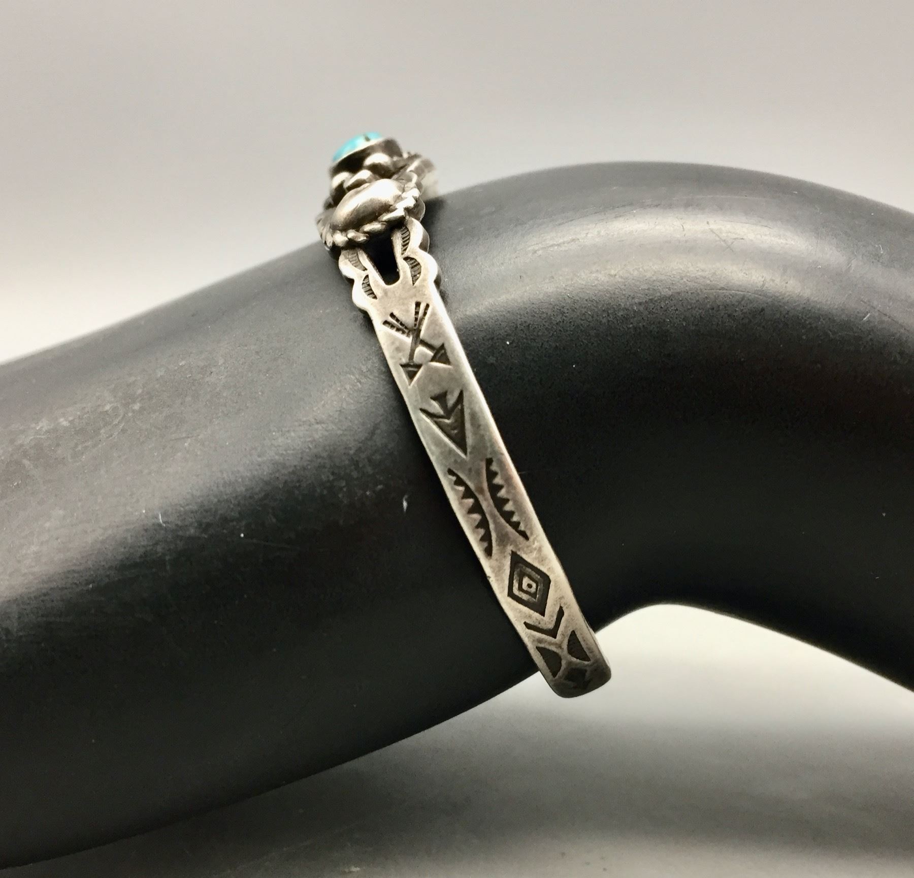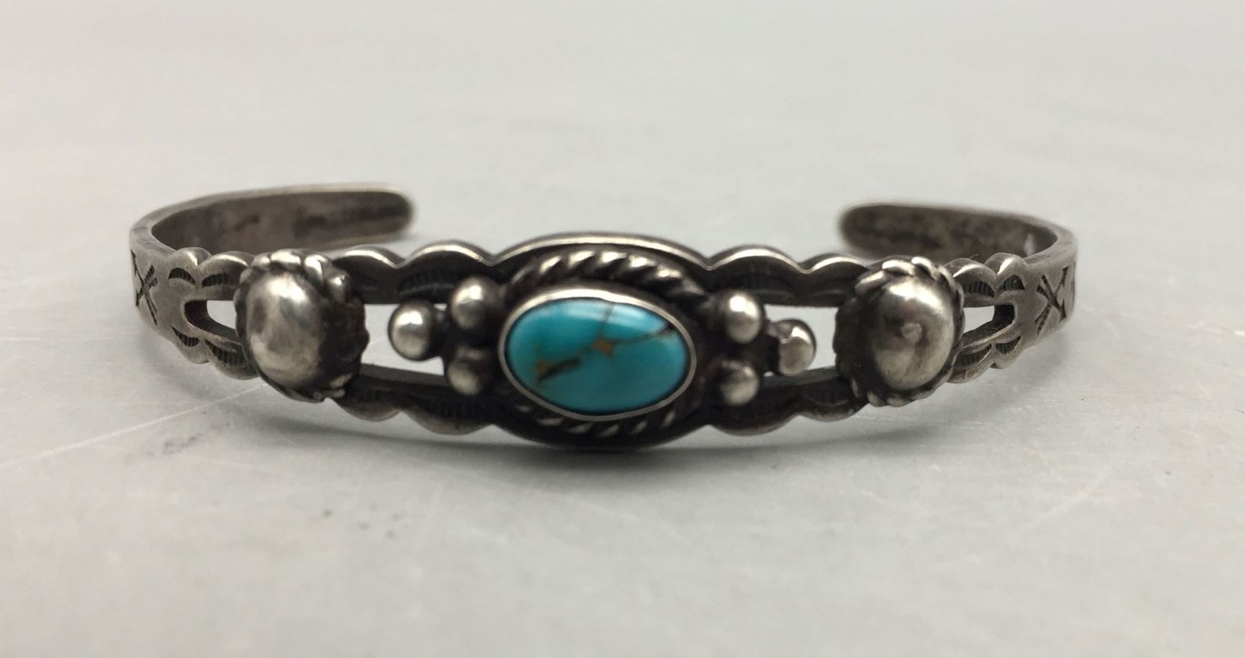 Description: For sale in this lot is this dainty Fred Harvey Era bracelet, set with a turquoise stone (small fracture in the stone). It has the popular arrow stamping on it. Marked as sterling silver. Maker: Has the Maisels shop mark. Approx. Age: Circa 1930s - 40s. Size: Inside circumference measures 4-3/4†long. Opening is an additional 1-1/4â€, fitting a 6†wrist. Width is 3/8â€. Weighs 9.1 grams. Condition: Good for its age, normal wear expected. Please look closely at the pictures - they are an important part of our description. Shipping: There will be a $5 handling / packaging fee for shipping this lot. The actual cost of postage will be added on top of that.