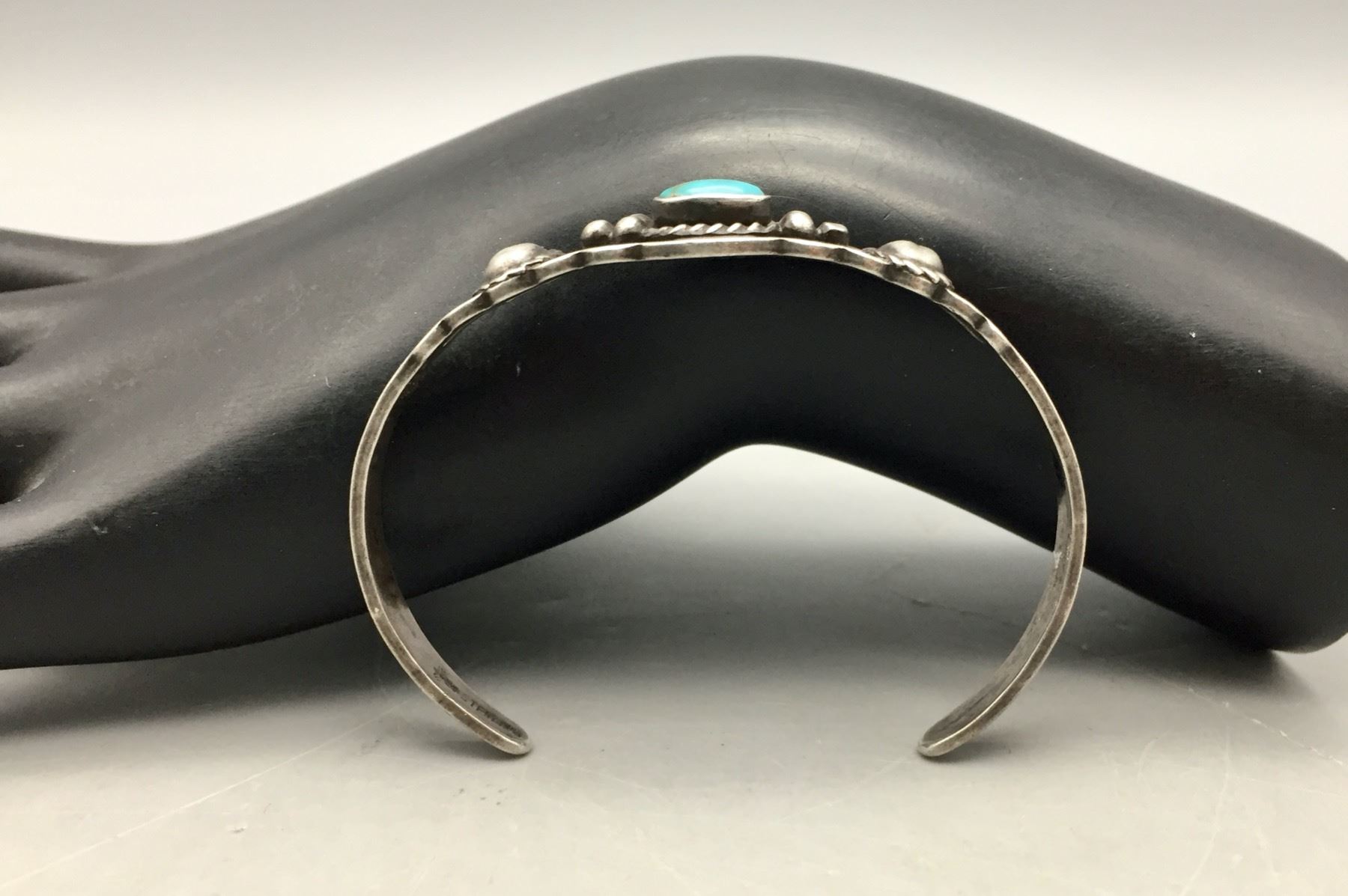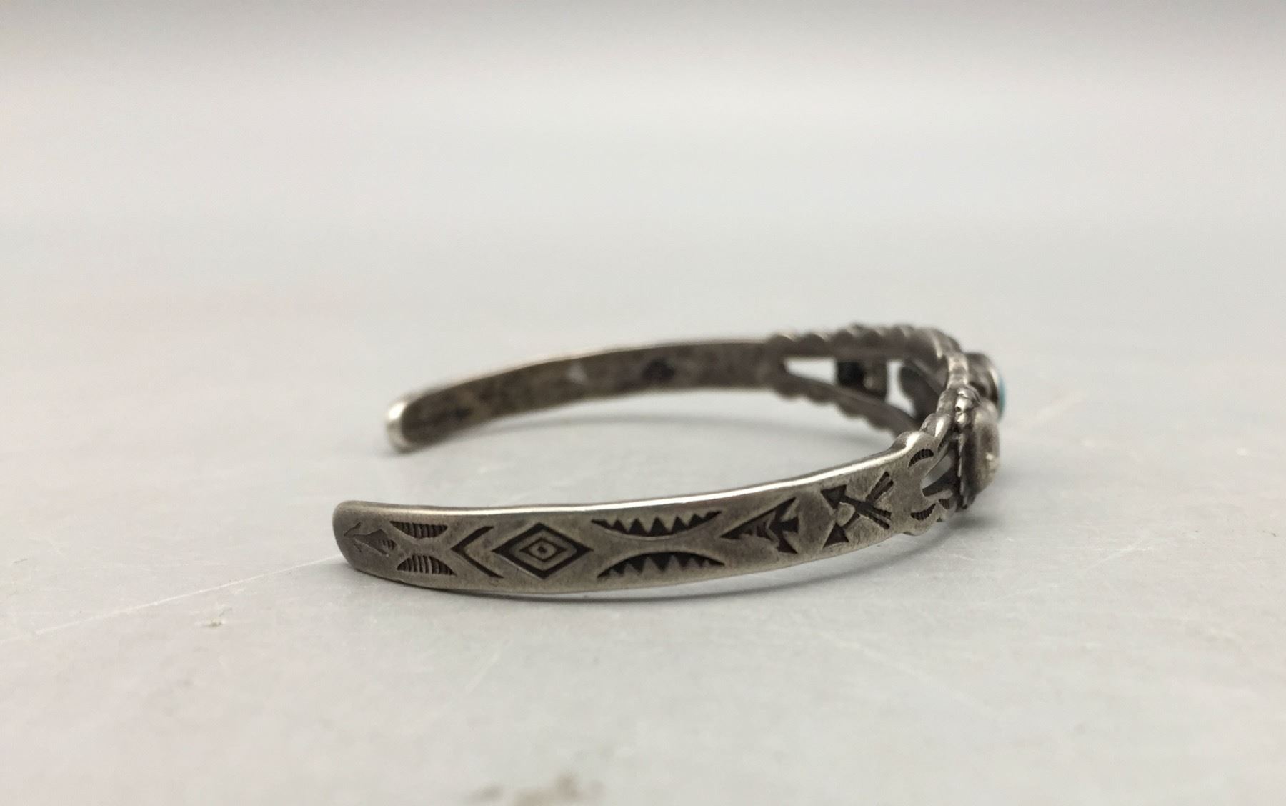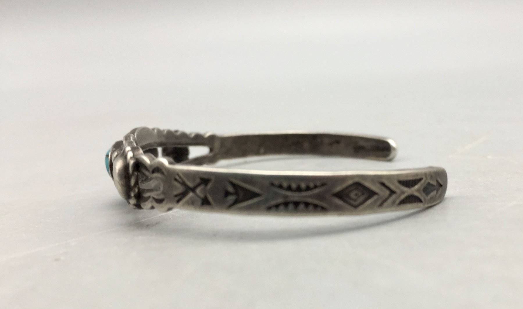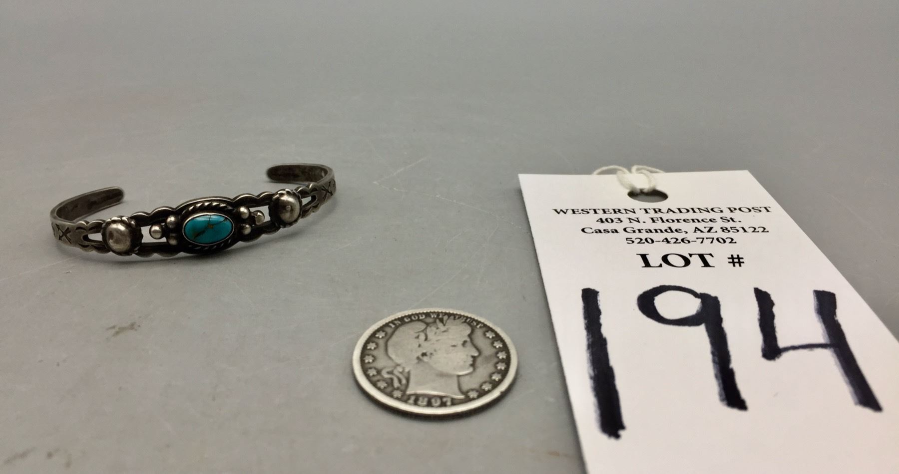 Description: For sale in this lot is this dainty Fred Harvey Era bracelet, set with a turquoise stone (small fracture in the stone). It has the popular arrow stamping on it. Marked as sterling silver. Maker: Has the Maisels shop mark. Approx. Age: Circa 1930s - 40s. Size: Inside circumference measures 4-3/4†long. Opening is an additional 1-1/4â€, fitting a 6†wrist. Width is 3/8â€. Weighs 9.1 grams. Condition: Good for its age, normal wear expected. Please look closely at the pictures - they are an important part of our description. Shipping: There will be a $5 handling / packaging fee for shipping this lot. The actual cost of postage will be added on top of that.