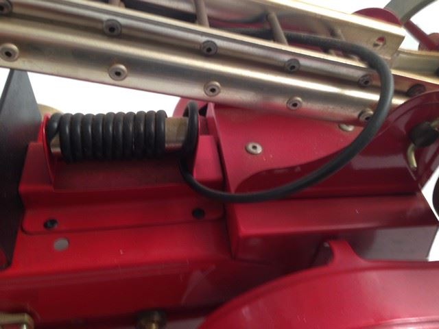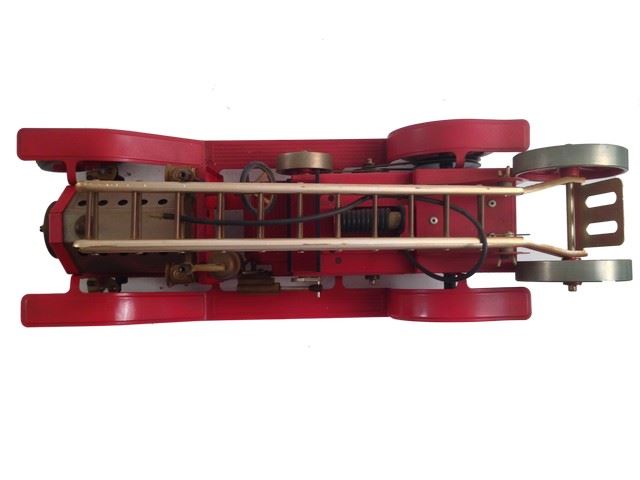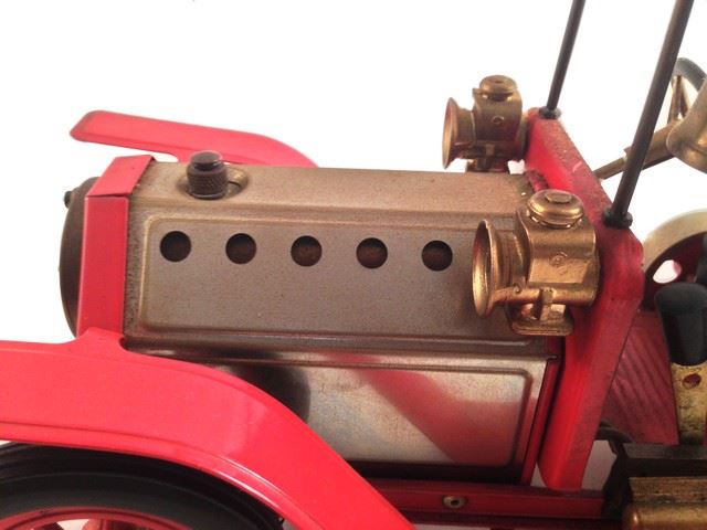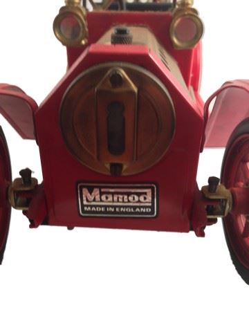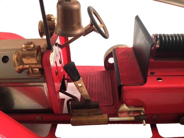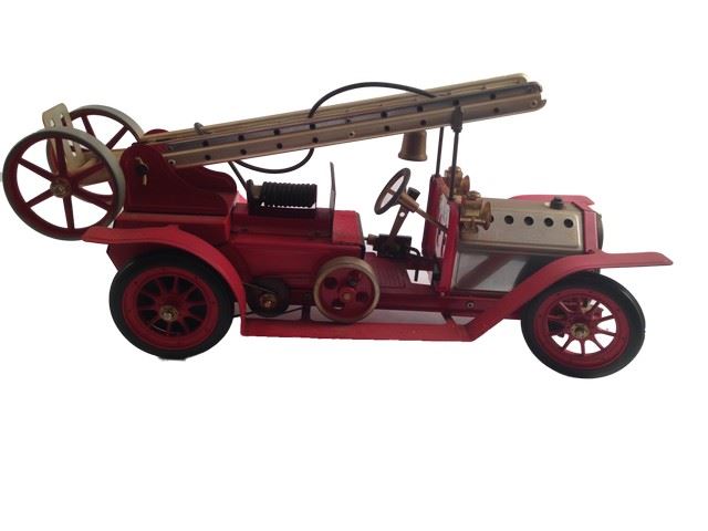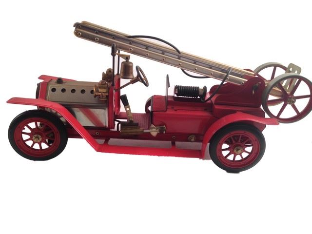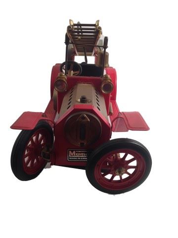 Vintage "Mamod" fire engine with working steering wheel and gear shift with wind up fire hose, latter on top pulls out to extend to the full length.(16x10)