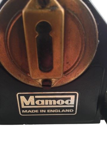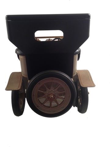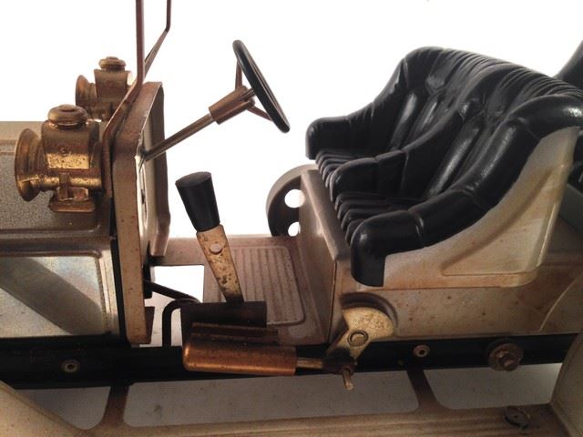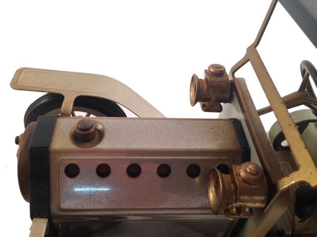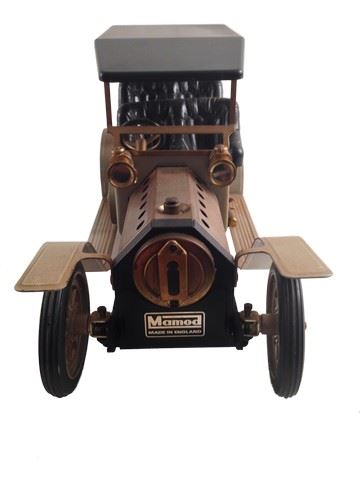 Vintage toy car, made of metal and rubber with working steering wheel and gear shift. Gold and black "Mamod". Made in England.(16x8)
