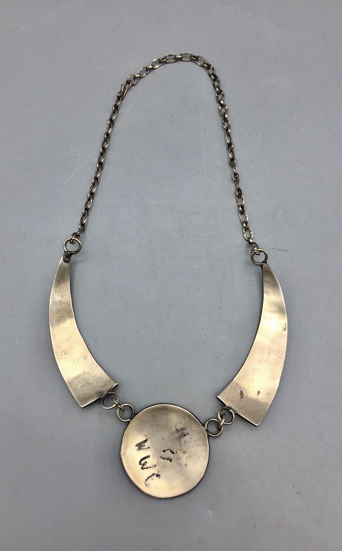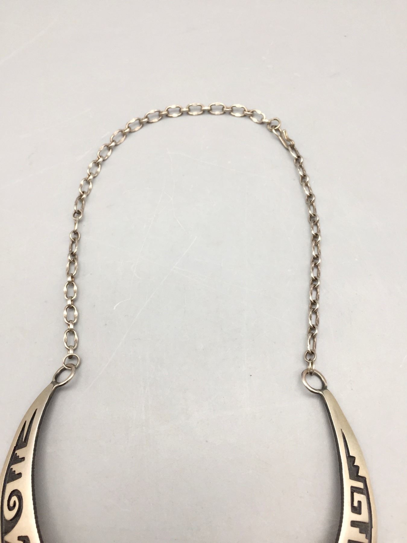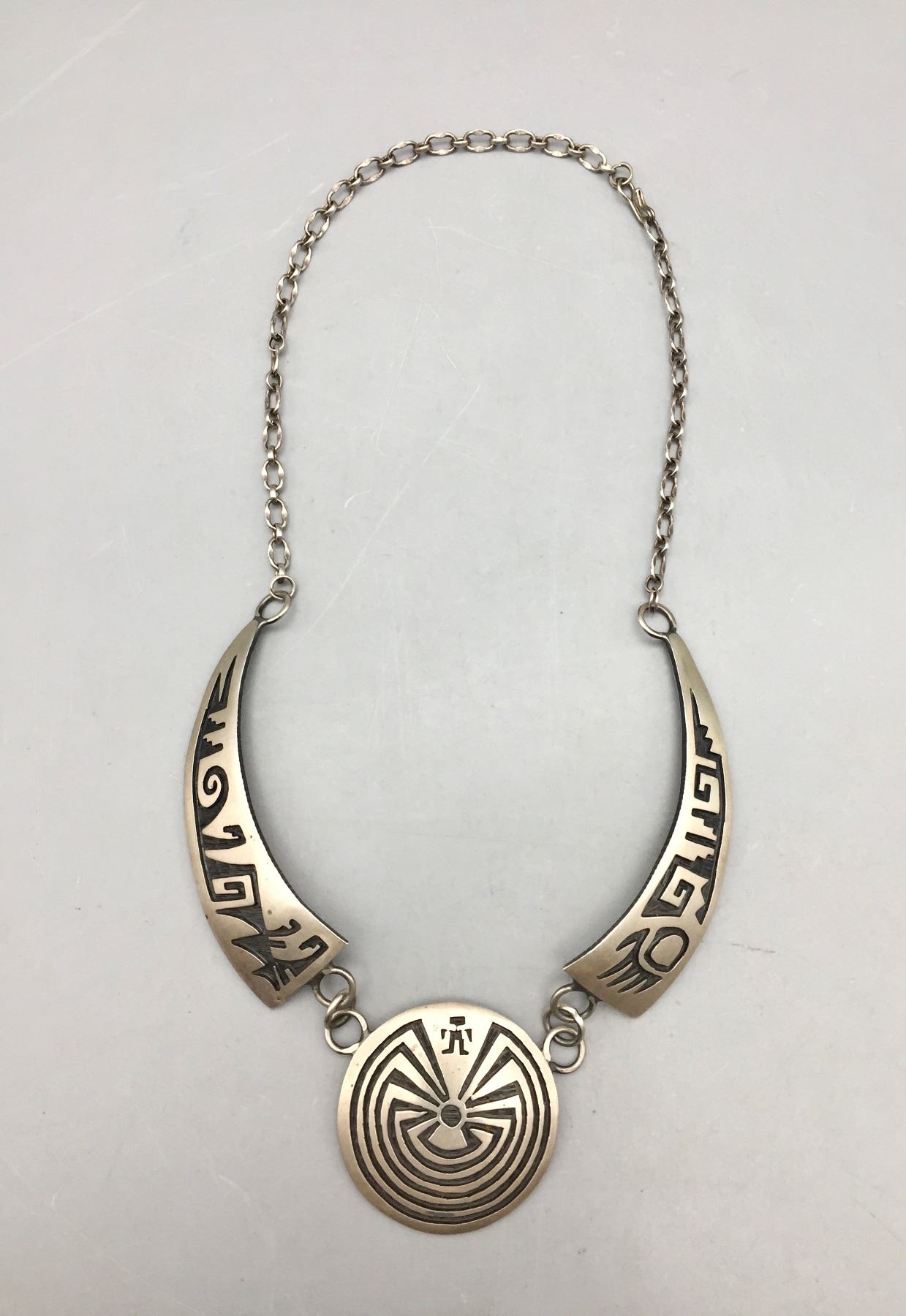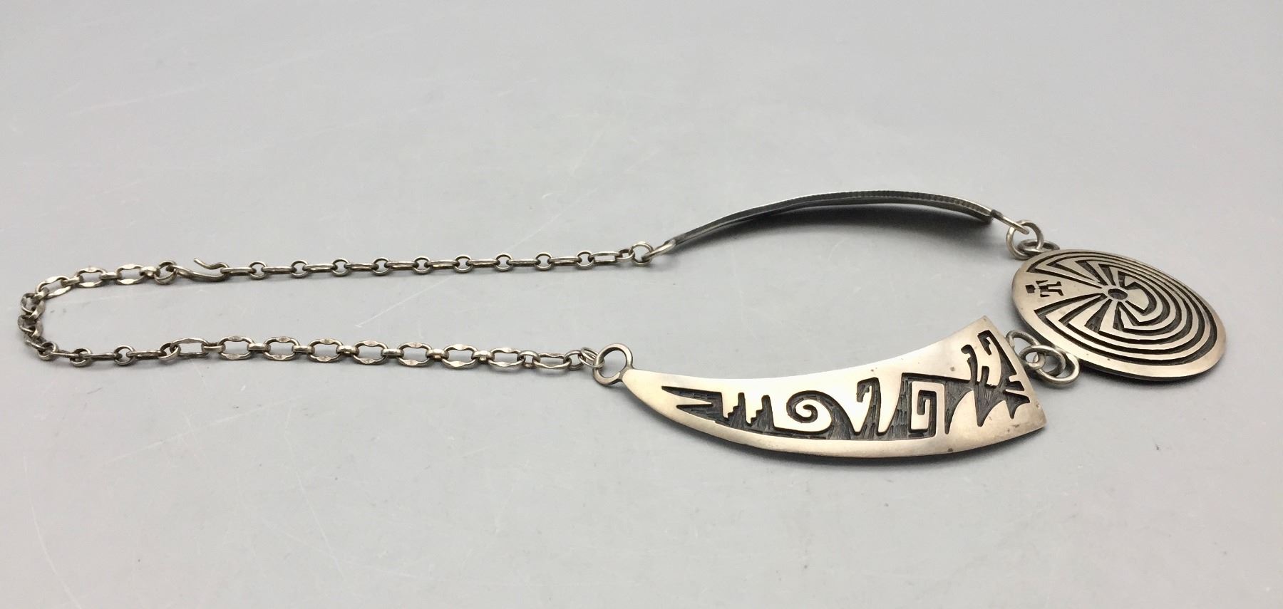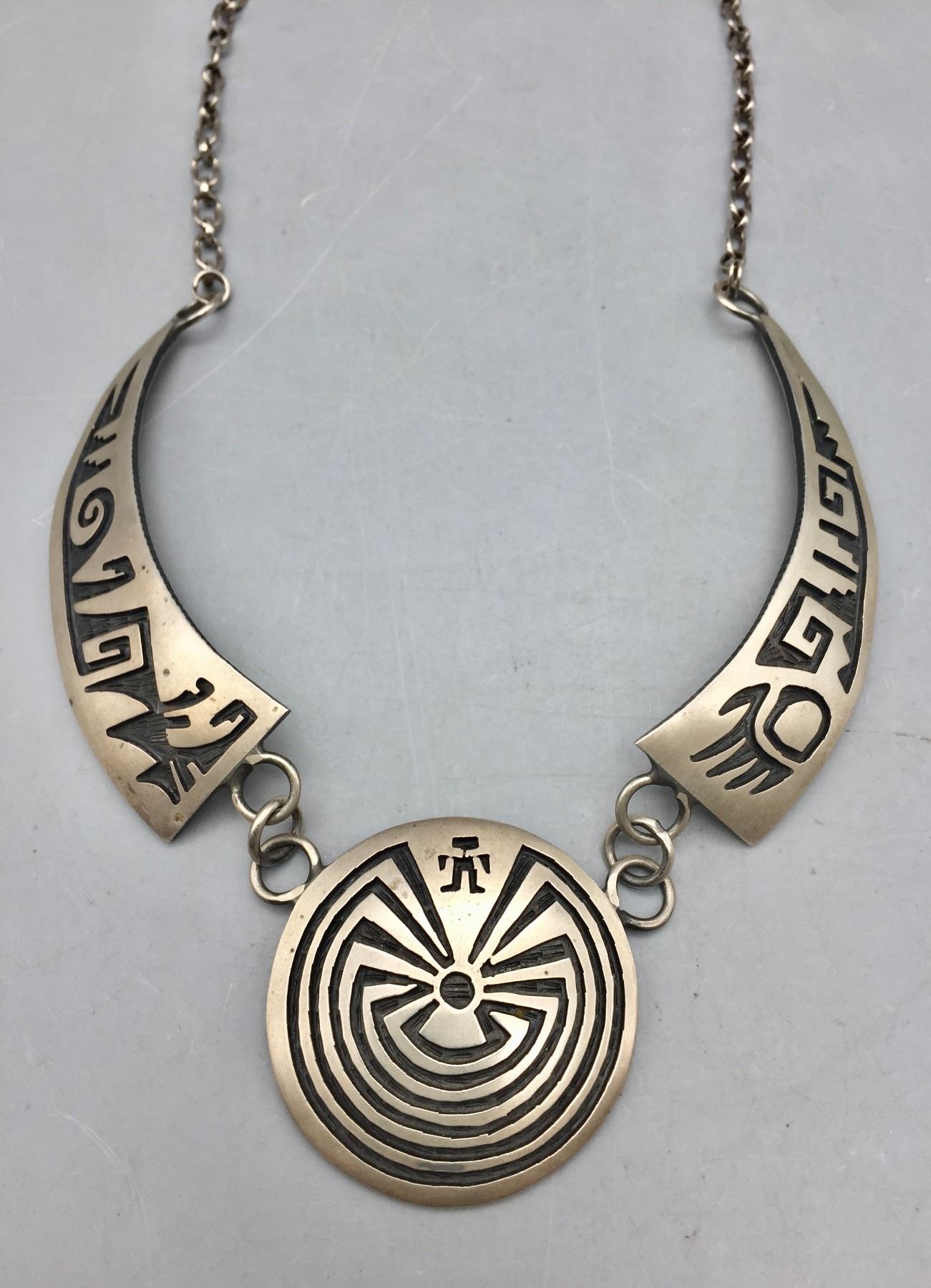 Description: For sale in this lot is a sterling silver, choker style necklace, featuring a Man in the Maze overlay design. Marked as sterling silver. Maker: Hallmarked with a broken arrow. Exact maker unknown. Approx. Age: Fairly modern. Size: Fits a 15” neck. Pendant measures 1”w x 1” tall. Weighs 42.8 grams. Condition: Good for its age, normal wear expected. Please look closely at the pictures - they are an important part of our description. Shipping: There will be a $5 handling / packaging fee for shipping this lot. The actual cost of postage will be added on top of that.