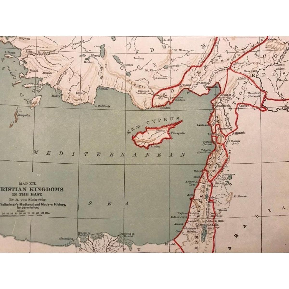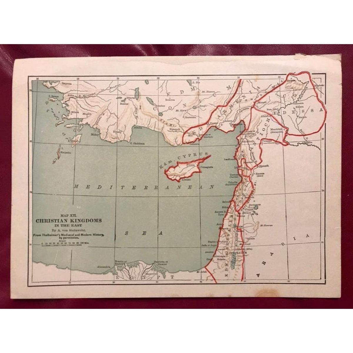 Map XII. Christian Kingdoms In The East by A. von Steinwehr, from Thalheimer's Medieval and Modern History. Shows armenia, Antioch, Edessa, Tripoli, Jerusalem, Cypress. 7 1/2" X 10 1/8".Â