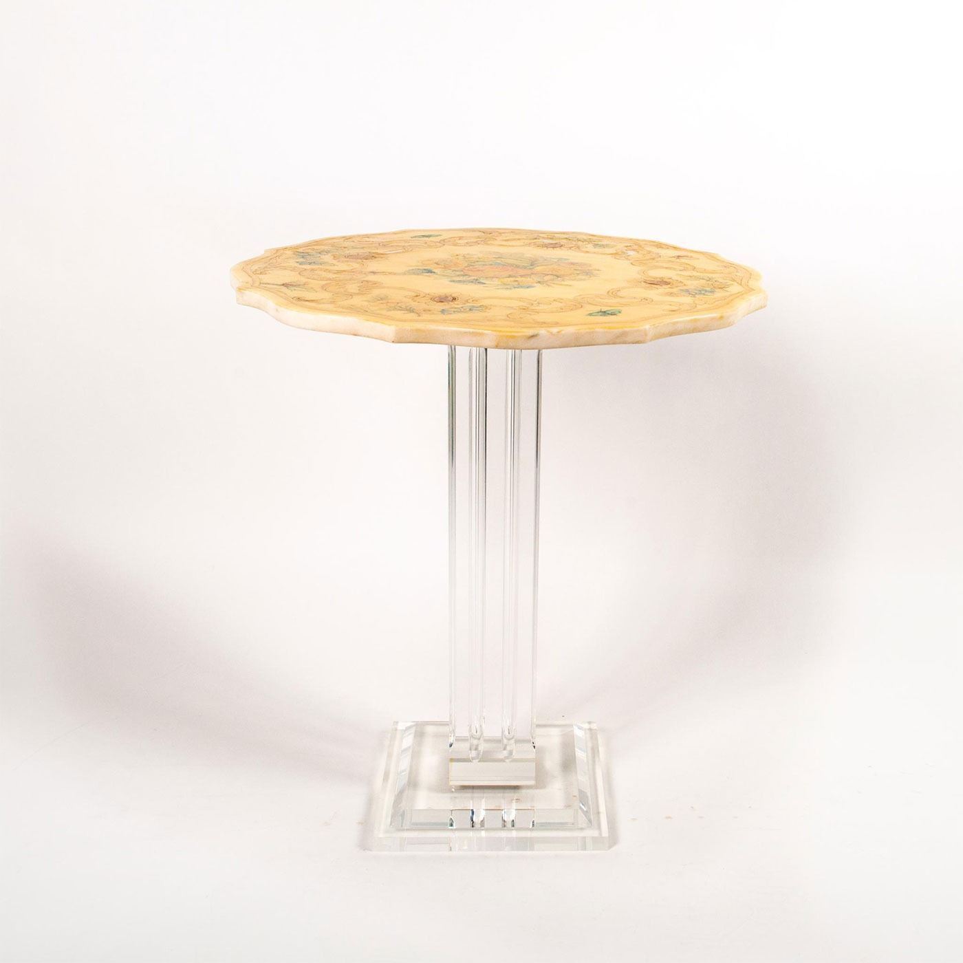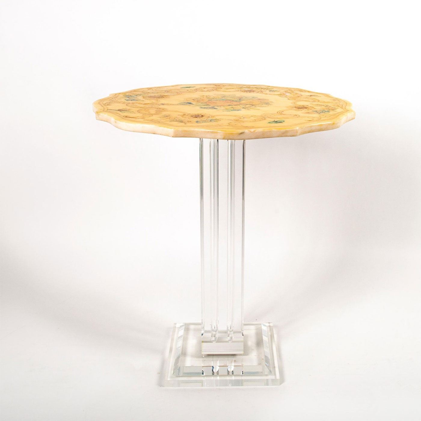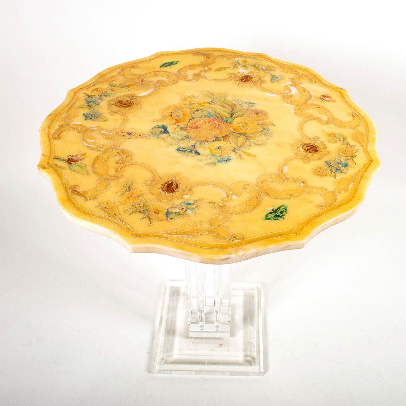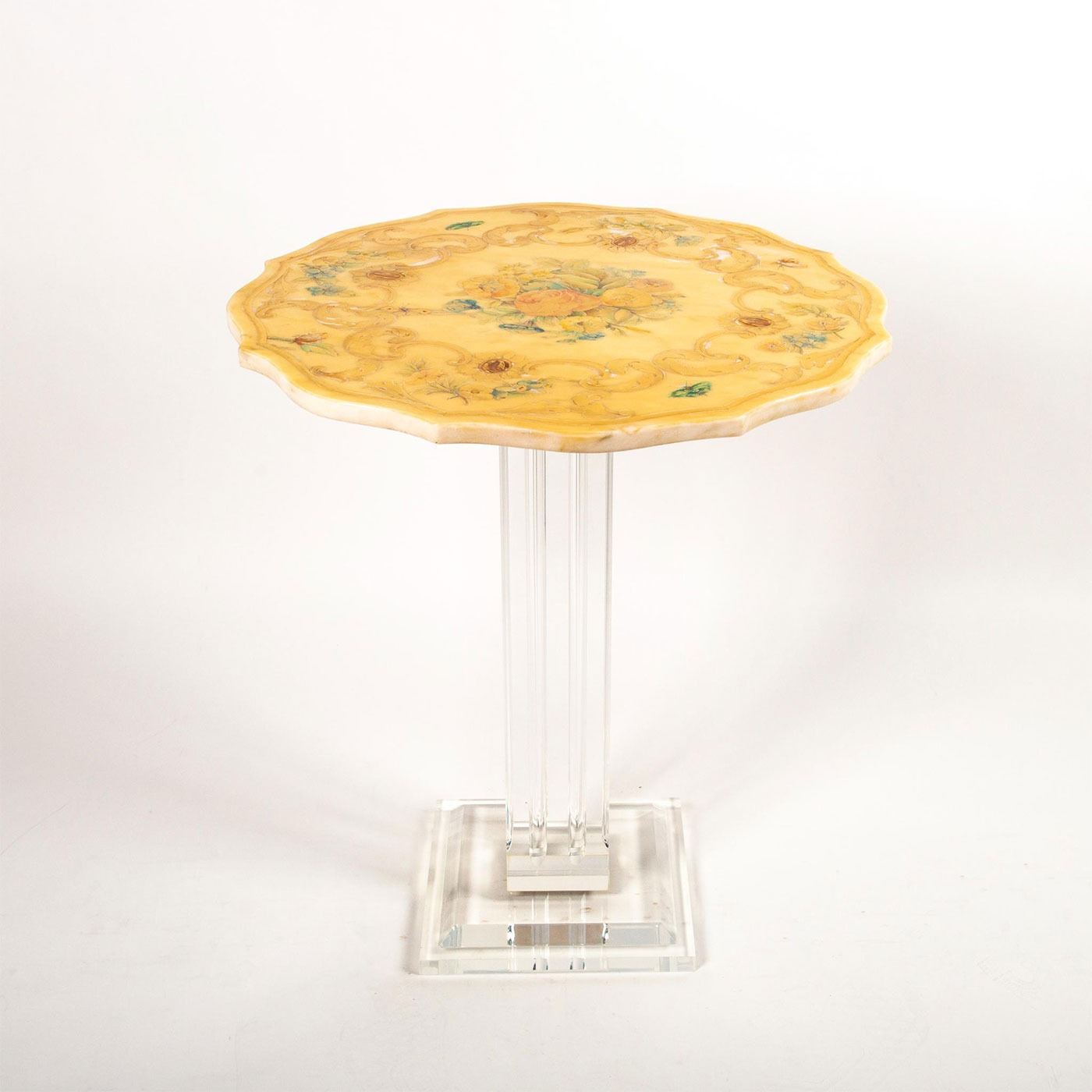 Beautiful caramel shade. Elegantly decorated with detailed inlaid floral patterns. Scalloped edge style. Paint chipping throughout. Table top: 25"D. Pillar: 27.5"H. #marble #floral #retro #vintage #inlaid