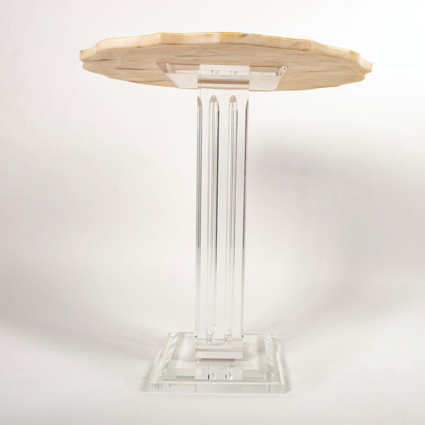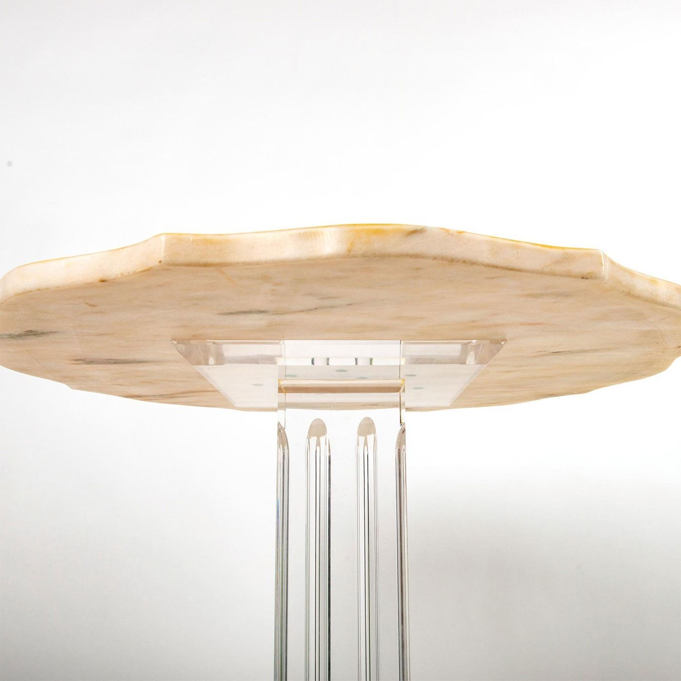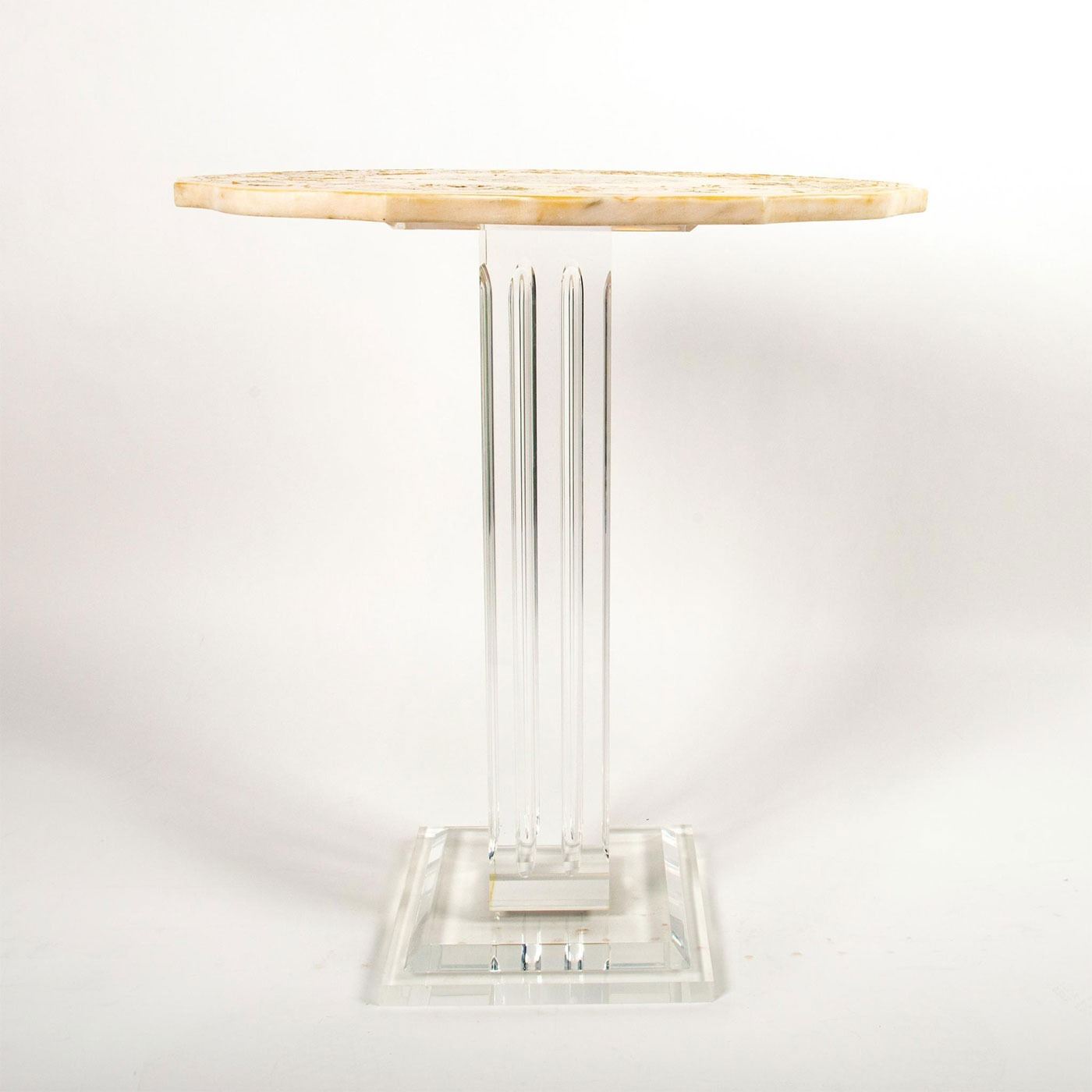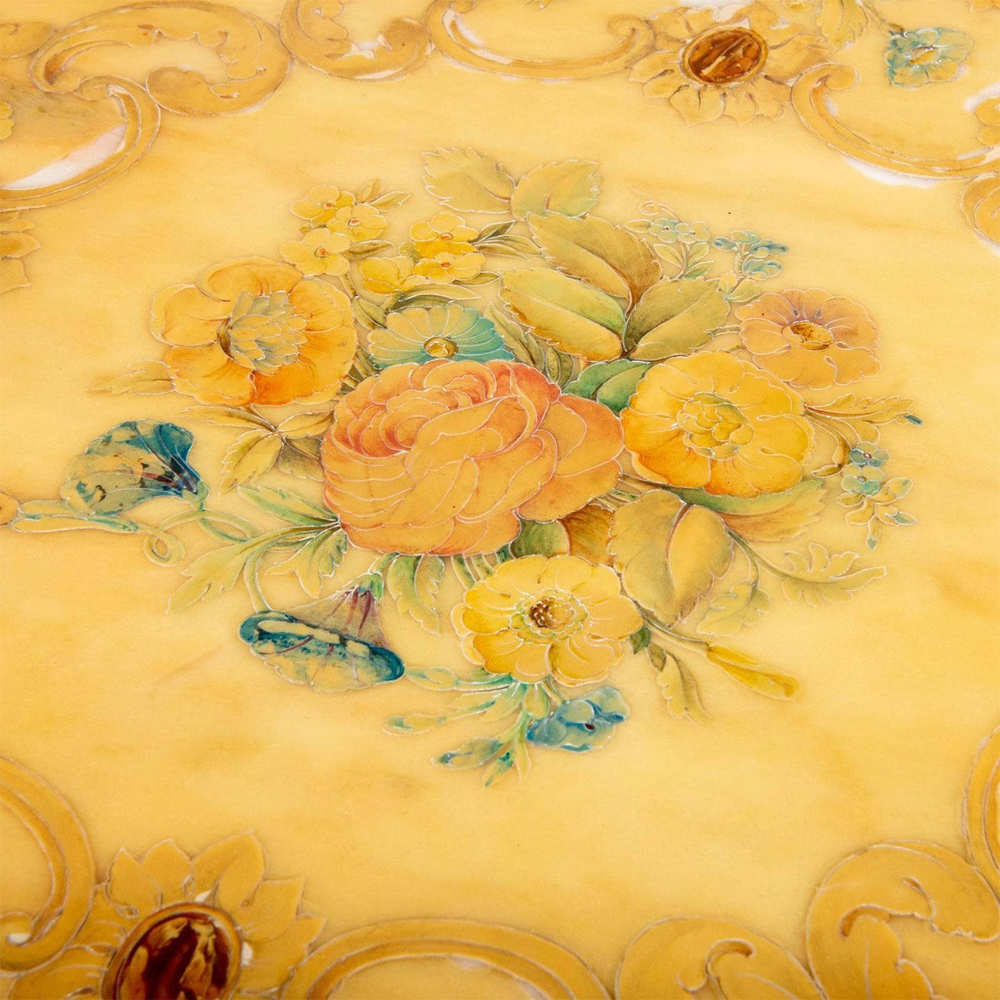 Beautiful caramel shade. Elegantly decorated with detailed inlaid floral patterns. Scalloped edge style. Paint chipping throughout. Table top: 25"D. Pillar: 27.5"H. #marble #floral #retro #vintage #inlaid