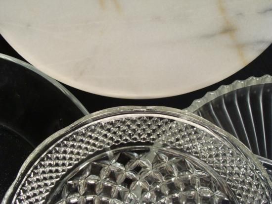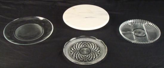 This is a vintage lazy Susan style rotating serving piece, with three separate glass plates that can rest on top. The lazy Susan is 12" in diameter. The plates are 12", 10" (with sections), and 9 1/2". They are all in excellent condition. * Bring a little ease, versatility, and style to your table with this lazy Susan set.