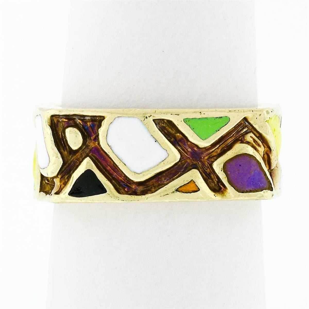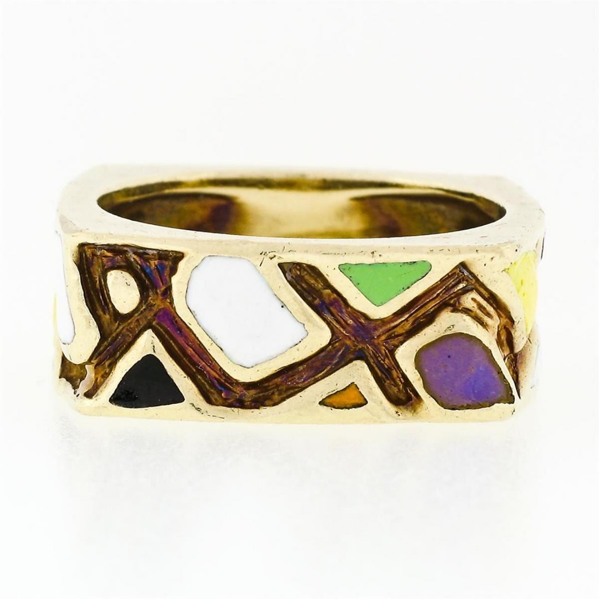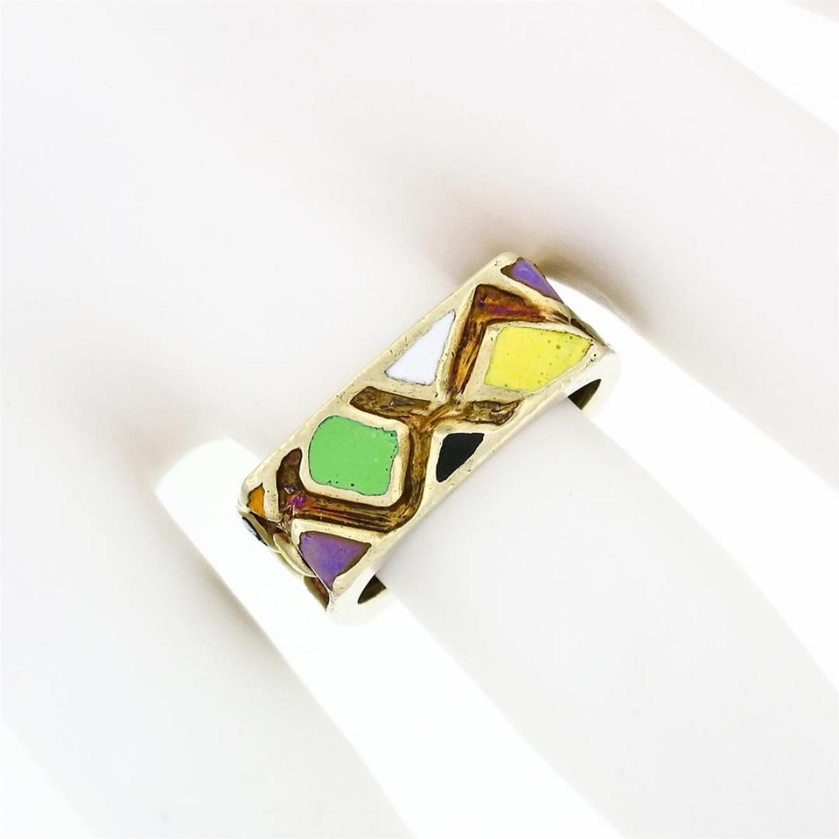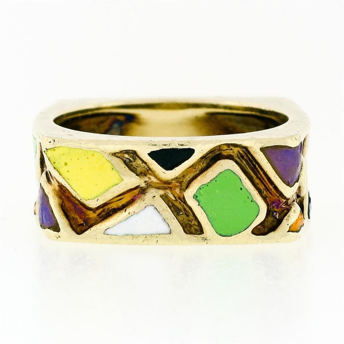Vintage Martine 14k Gold Multicolored Enamel Mosaic Squared Eternity Band Ring. A vintage solid 14k yellow gold eternity band ring made by Martine featuring a multi-colored enamel mosaic pattern.The ring is size 7.5, weighs a total of 9.45 grams, and measures 8.0mm wide.