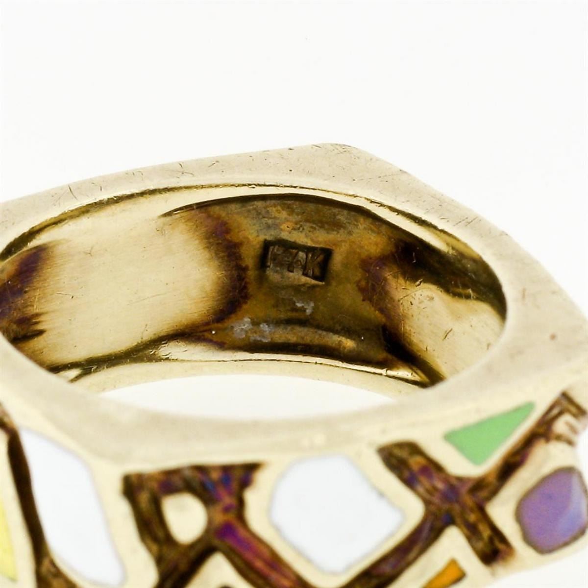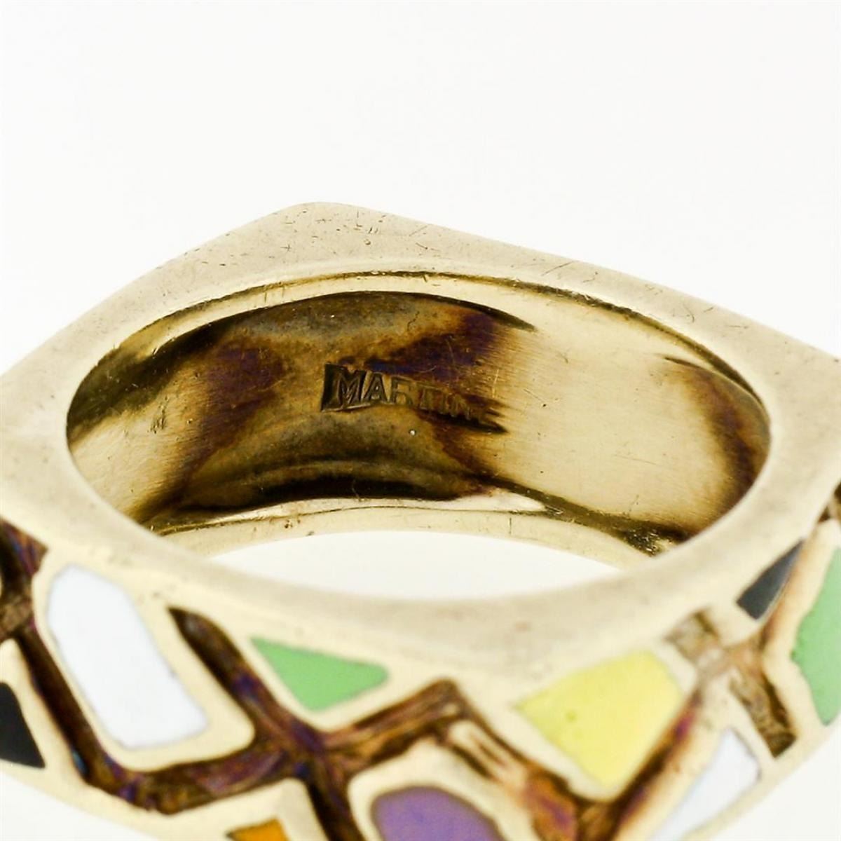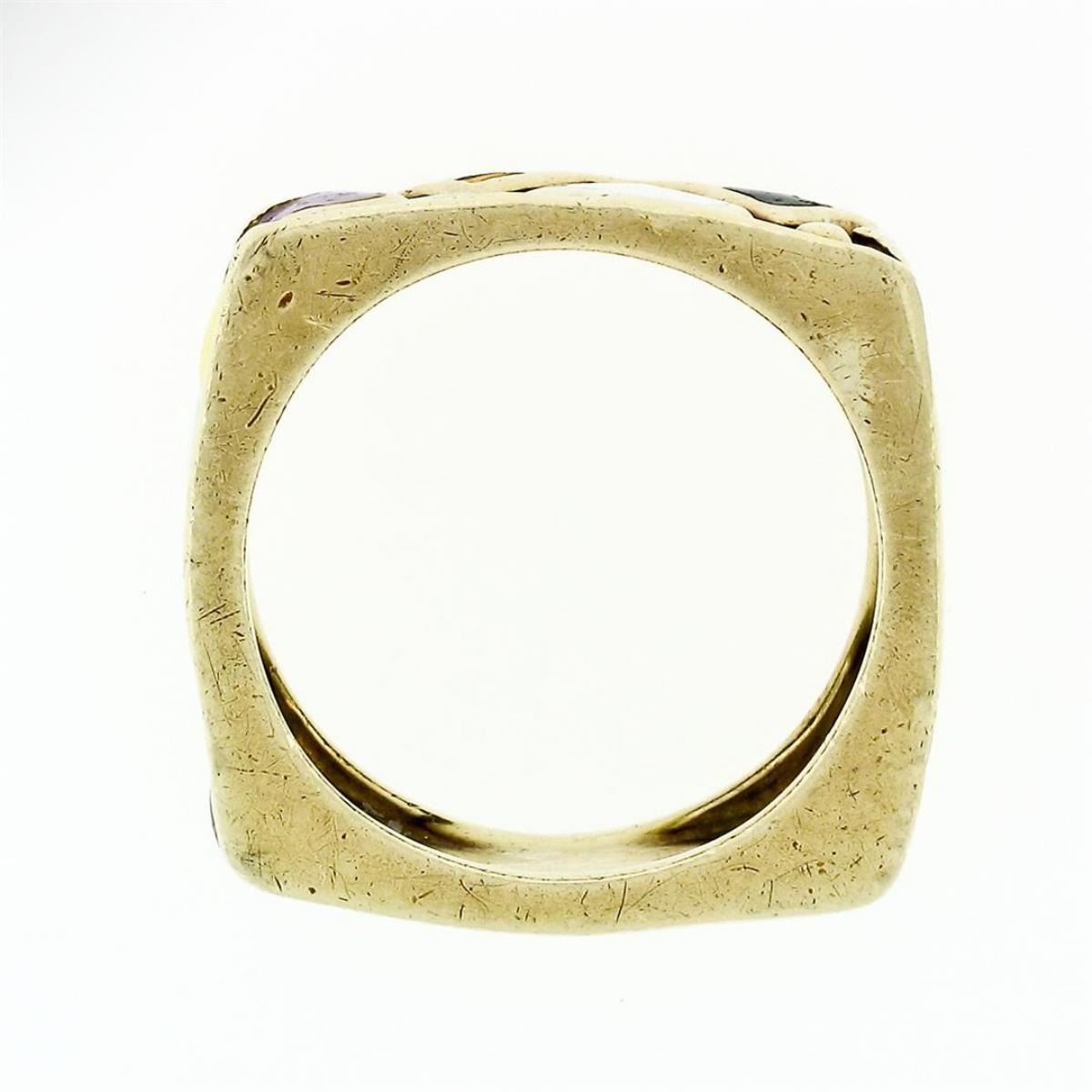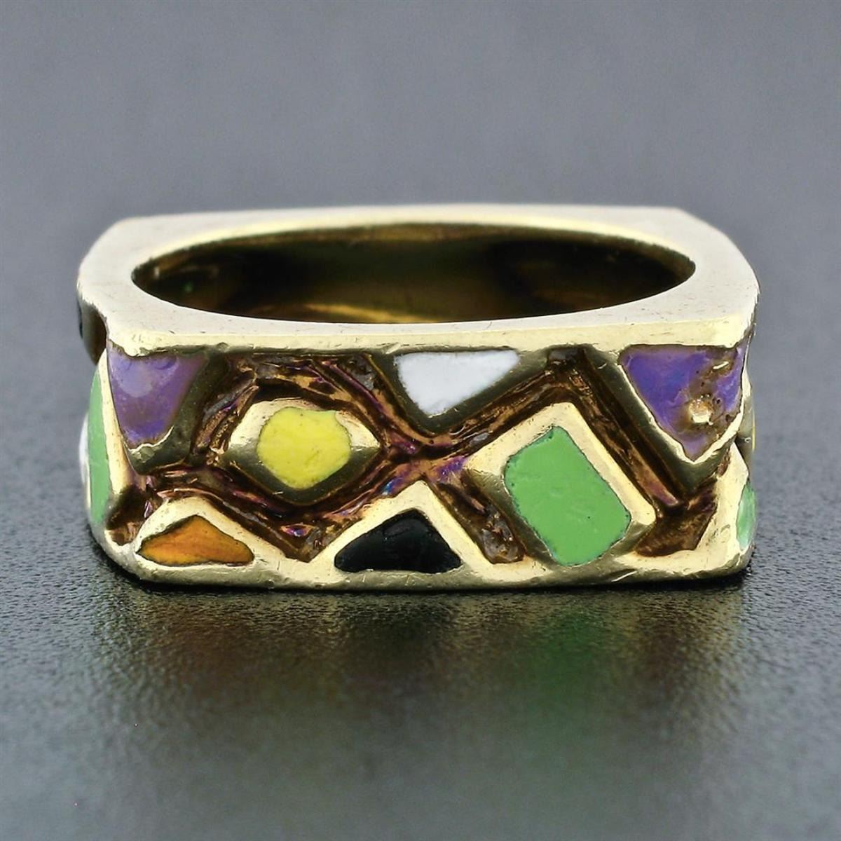 Vintage Martine 14k Gold Multicolored Enamel Mosaic Squared Eternity Band Ring. A vintage solid 14k yellow gold eternity band ring made by Martine featuring a multi-colored enamel mosaic pattern.The ring is size 7.5, weighs a total of 9.45 grams, and measures 8.0mm wide.