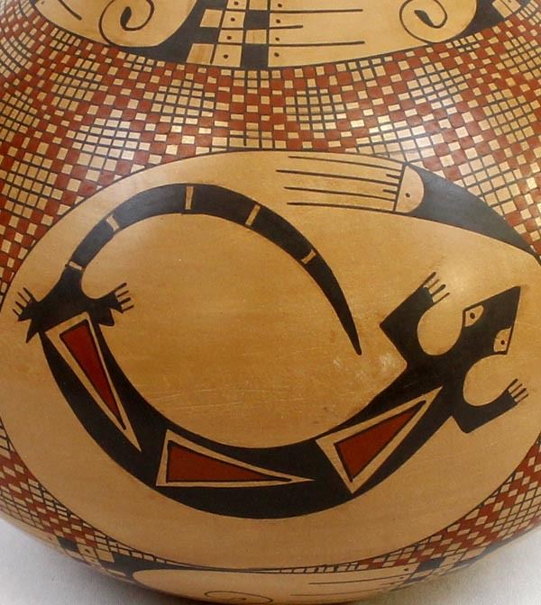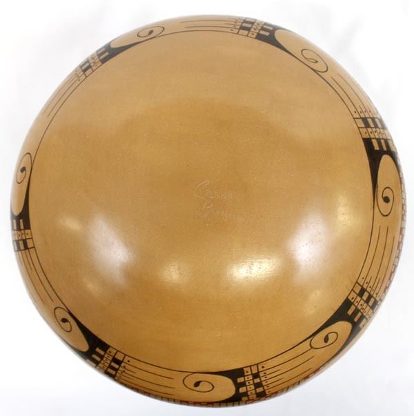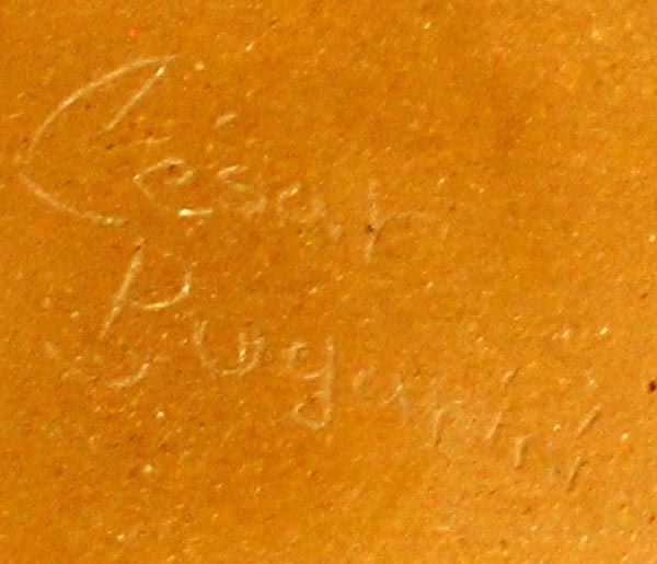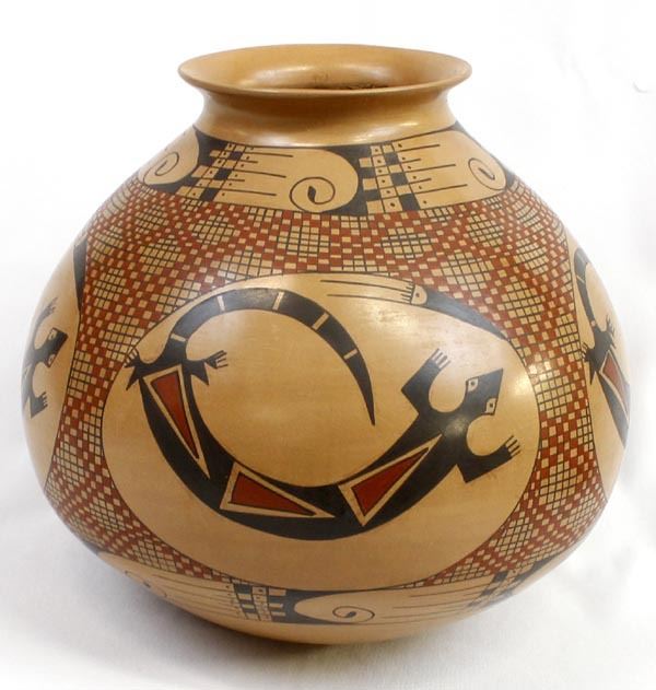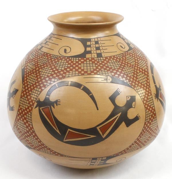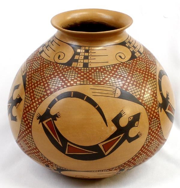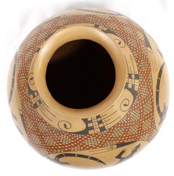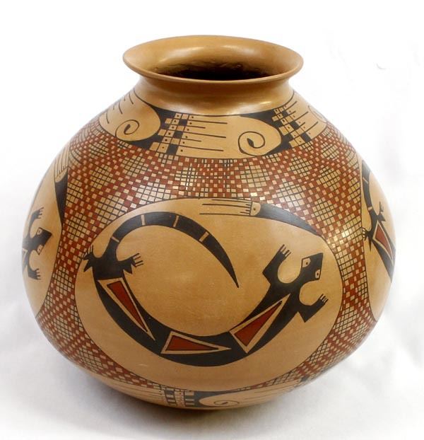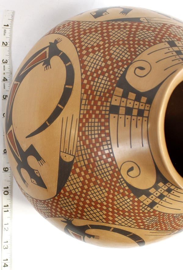 Large Vintage Mata Ortiz Pottery Olla by Cesar Bugarini, measures 11.5'' x 13''D and signed on the bottom, lizard motif