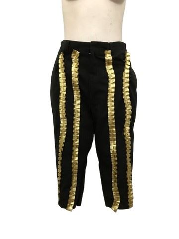 Vintage, custom made matador style cropped pants with gold ribbon detail down the entire pant leg. Was made for one of the oldest and largest costume stores in Los Angeles that has been in business for over 75 years. Has been used in several photo shoots and productions over time.
