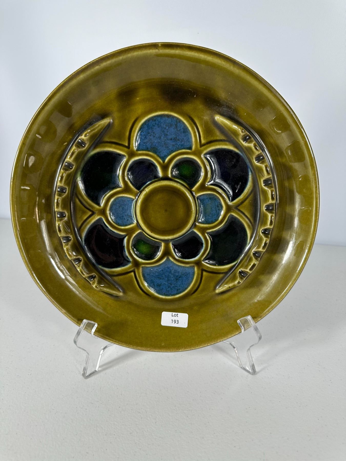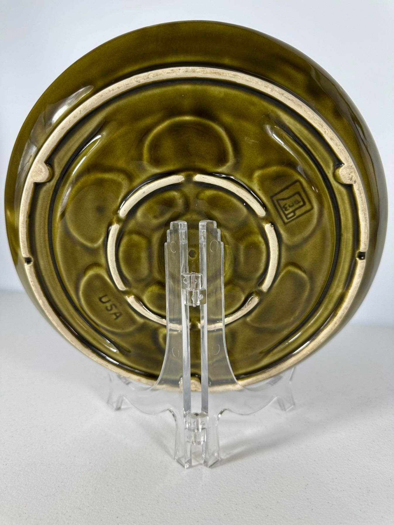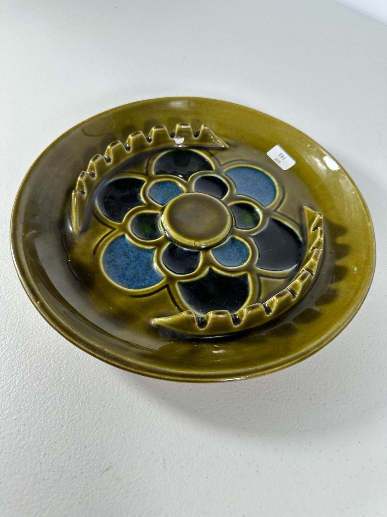 A mid-century USA pottery ashtray in olive green glaze with bold floral motif in blue and black. Marked “USA” on underside with impressed design. Large round form with resting grooves. A classic collectible ashtray with vibrant retro appeal.