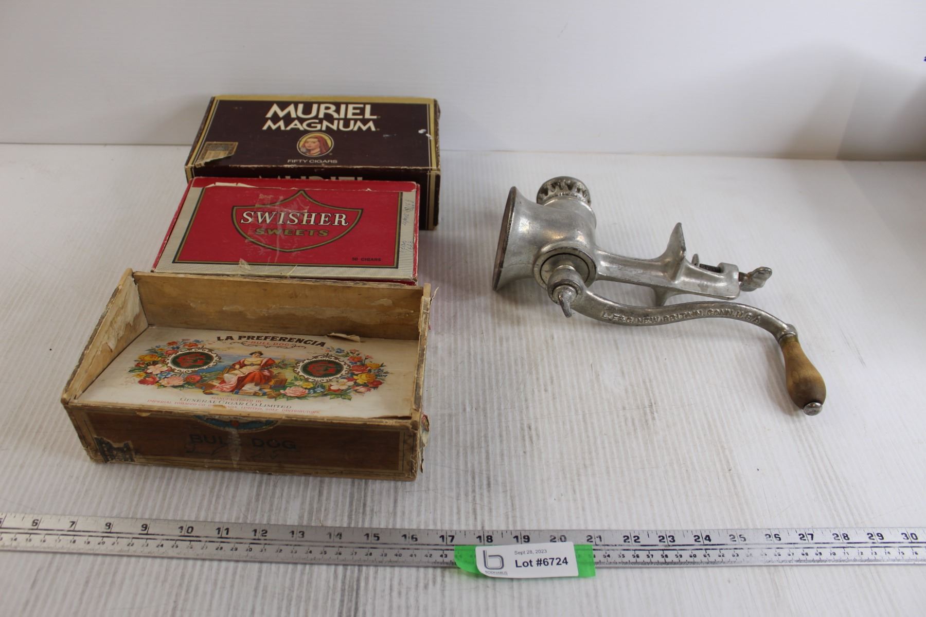 Vintage Meat Grinder, (3) Cigar Boxes