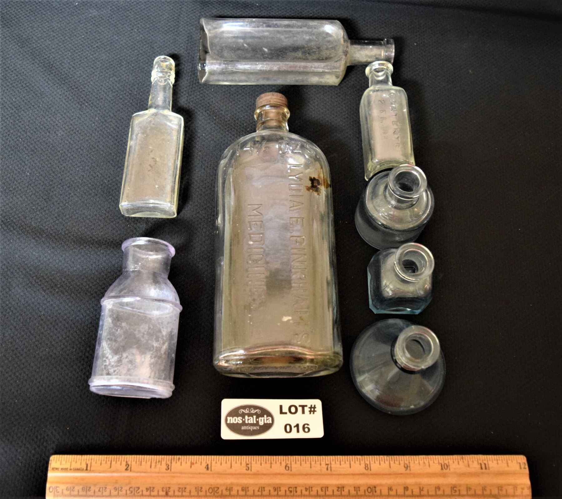 Vintage Medicine Bottles and Set of 3 Aqua Ink Wells
