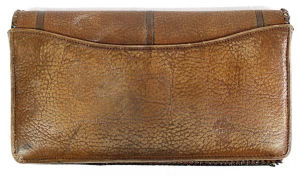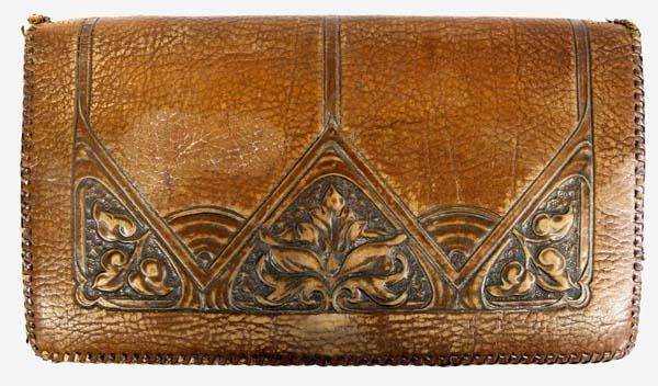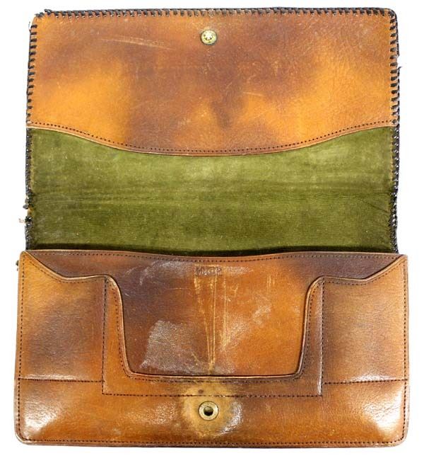 Antique/Vintage Meeker Hand Tooled Leather Purse, measures 9'' x 5'', stamped inside, green velvet lines, snap closure coin purse inside, 3 inside slip pockets, snap closure, Art Deco motif, some stitch damage on borders