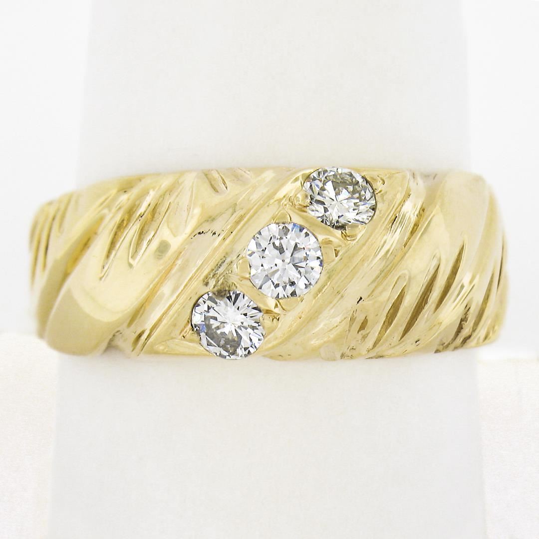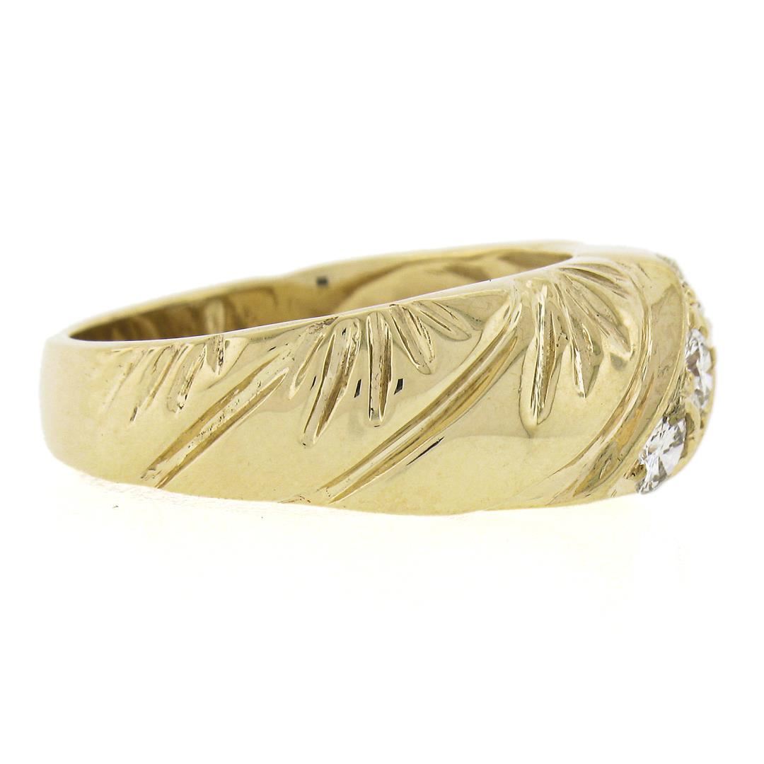 A vintage solid 10k rosy yellow gold men's band ring, with 3 round cut natural diamonds (H/I - VS2-SI2 ; 0.50ctw). The ring is size 10.5, weighs a total of 7.2 grams, and measures 9.3mm wide.