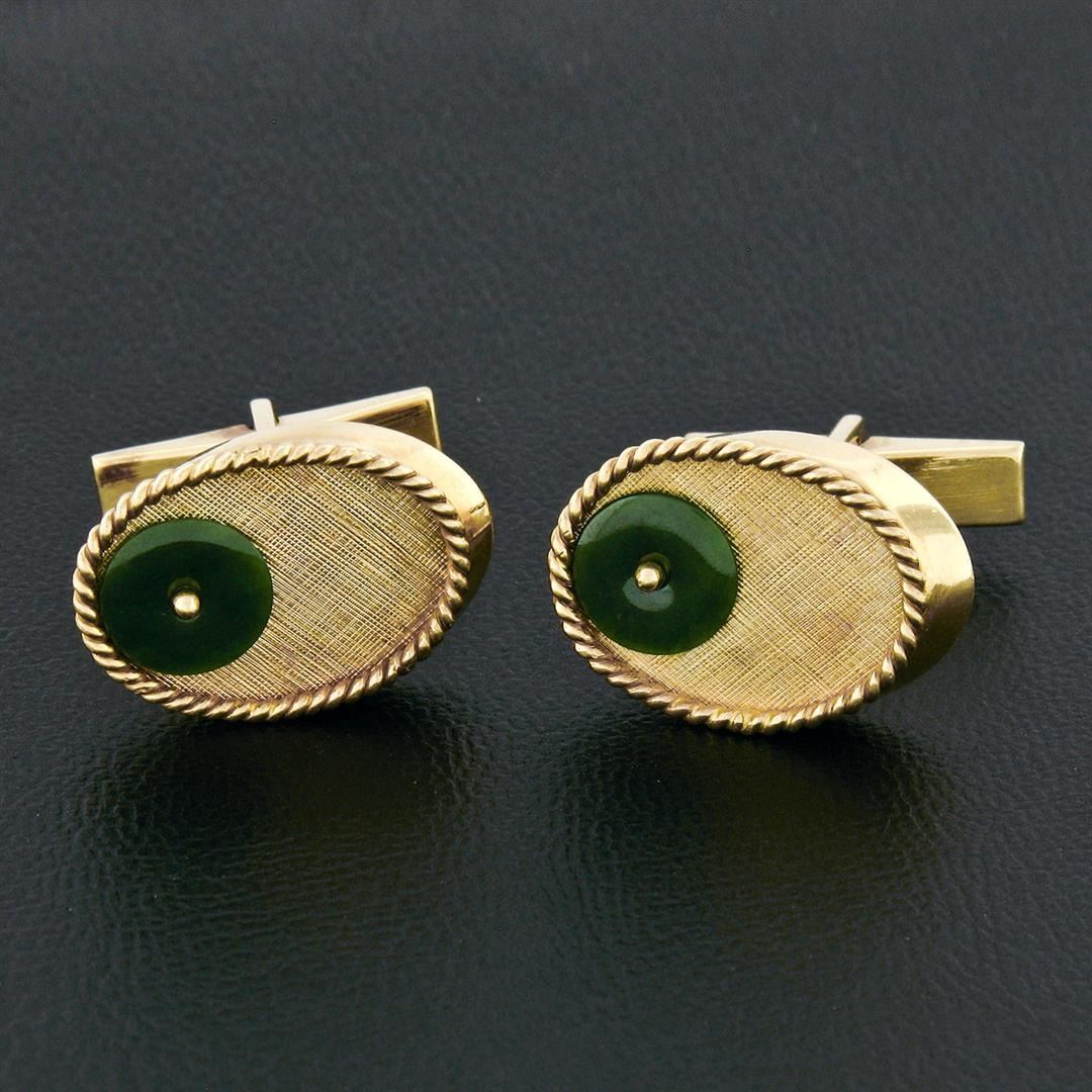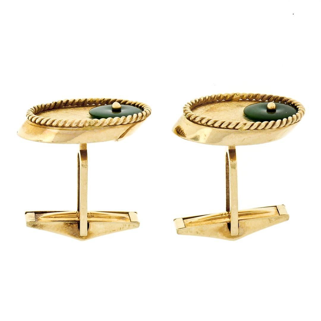 A vintage solid 14k yellow gold oval cufflinks, with 2 disc shape natural jade (8.2mm). These cuff links have a swivel design with a clearance of 9.65mm, weigh a total of 10.52 grams, and the front panels measure 20.25x14.65mm.