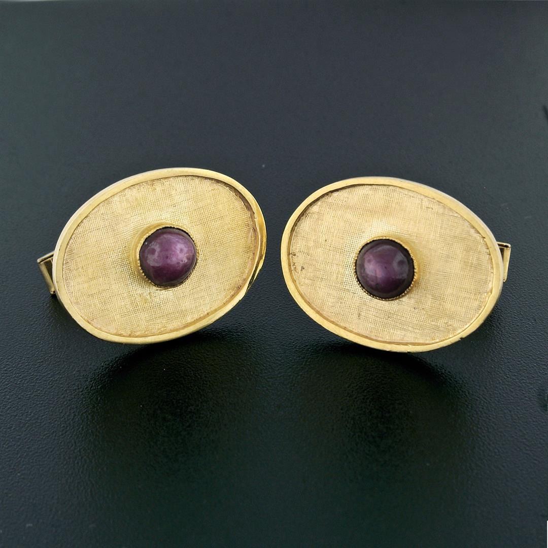 A vinatge solid 14k yellow gold oval cufflinks. with 2 round cabochon cut natural star rubies (6mm). These cuff links have a swivel design with a clearance of 13mm, weigh a total of 12.09 grams, and the front panels measure 23.6x17.75mm.