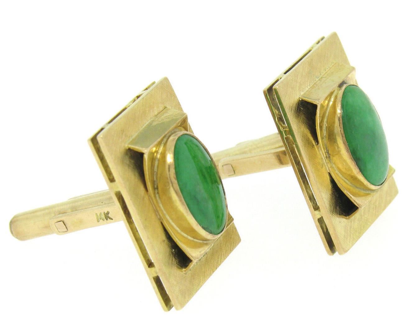 Vintage Men's 14k Yellow Gold EGL Deep Green Jadeite Jade Rectangular Cufflinks. Please see photos and description for all available information. A vintage solid 14k yellow gold rectangular cufflinks, featuring 2 EGL certified oval cut natural jadite jade (13.70x9.50mm - 7.00ctw). These cuff links have a swivel design with a clearance of 23.0mm, weigh a total of 19.80 grams, and the front panels measure 23.0x17.2mm. Comes with all original relevant certifications.
