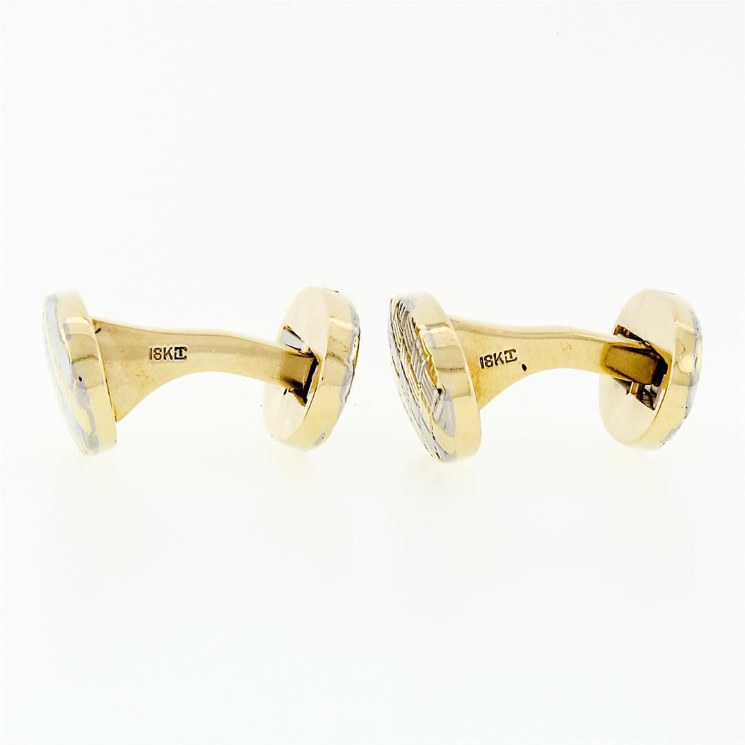 A pair of vintage solid 18k two tone gold cufflinks, with woven basket and weave pattern. These cuff links have a Swivel Back design with a clearance of 15mm, weigh a total of 28.52 grams, and the front panels measure 18x12.2mm.