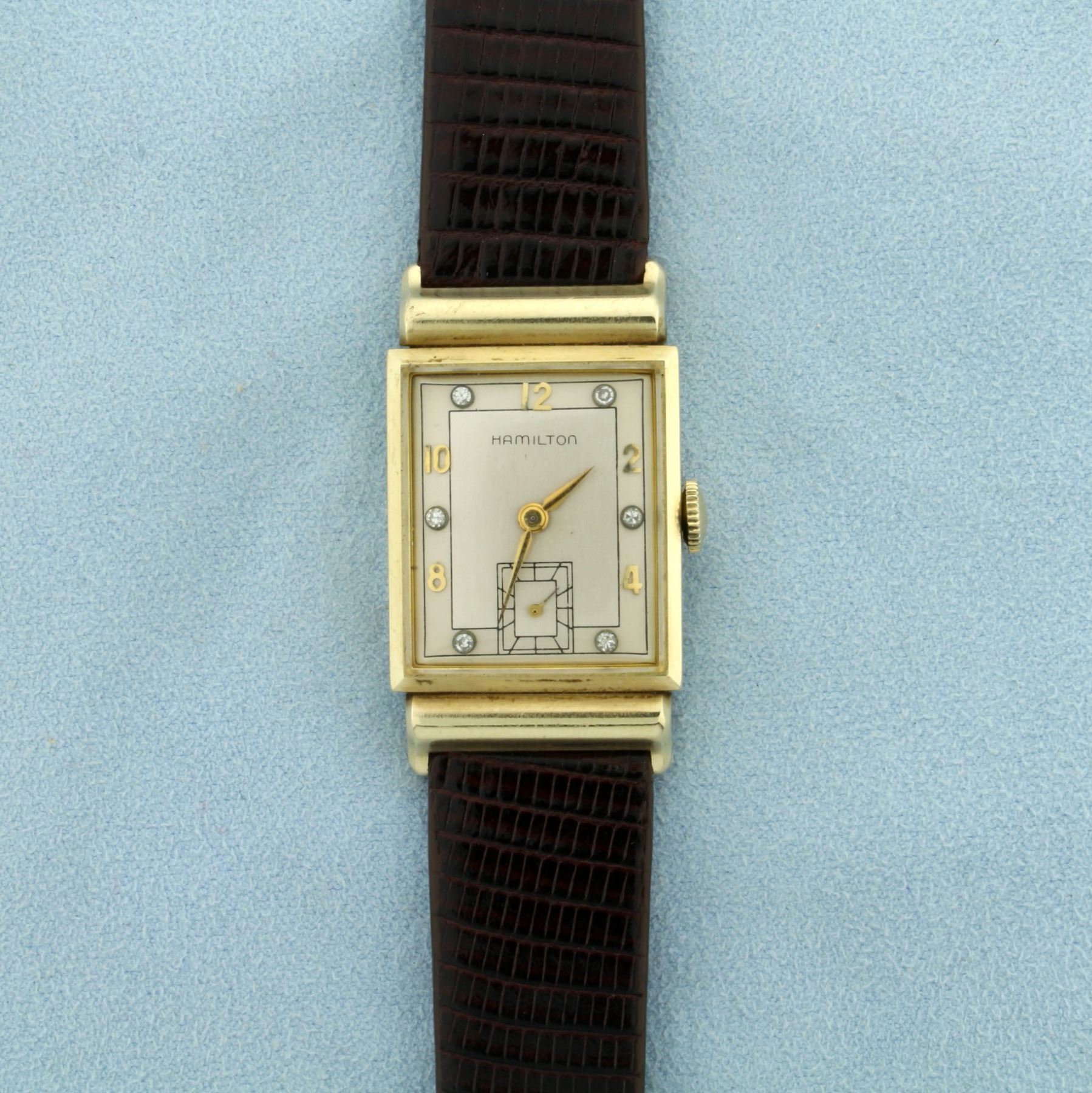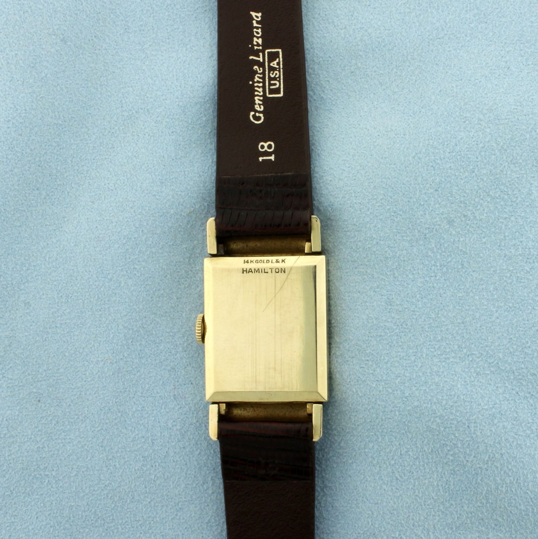 In Solid 14K Yellow Gold. Wind up movement runs great, in excellent condition with no scratching on crystal and minimal scratching on case. New lizard band. 45.6g