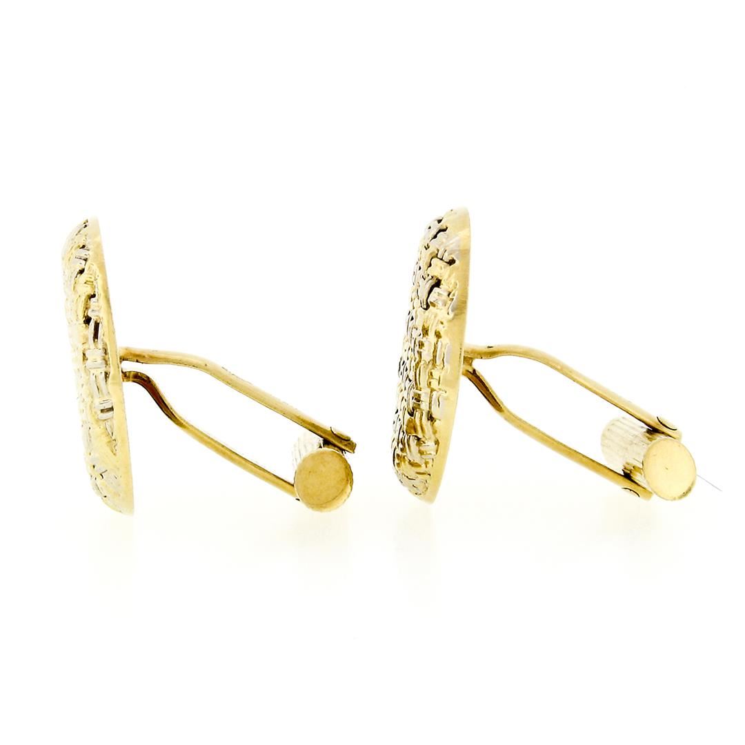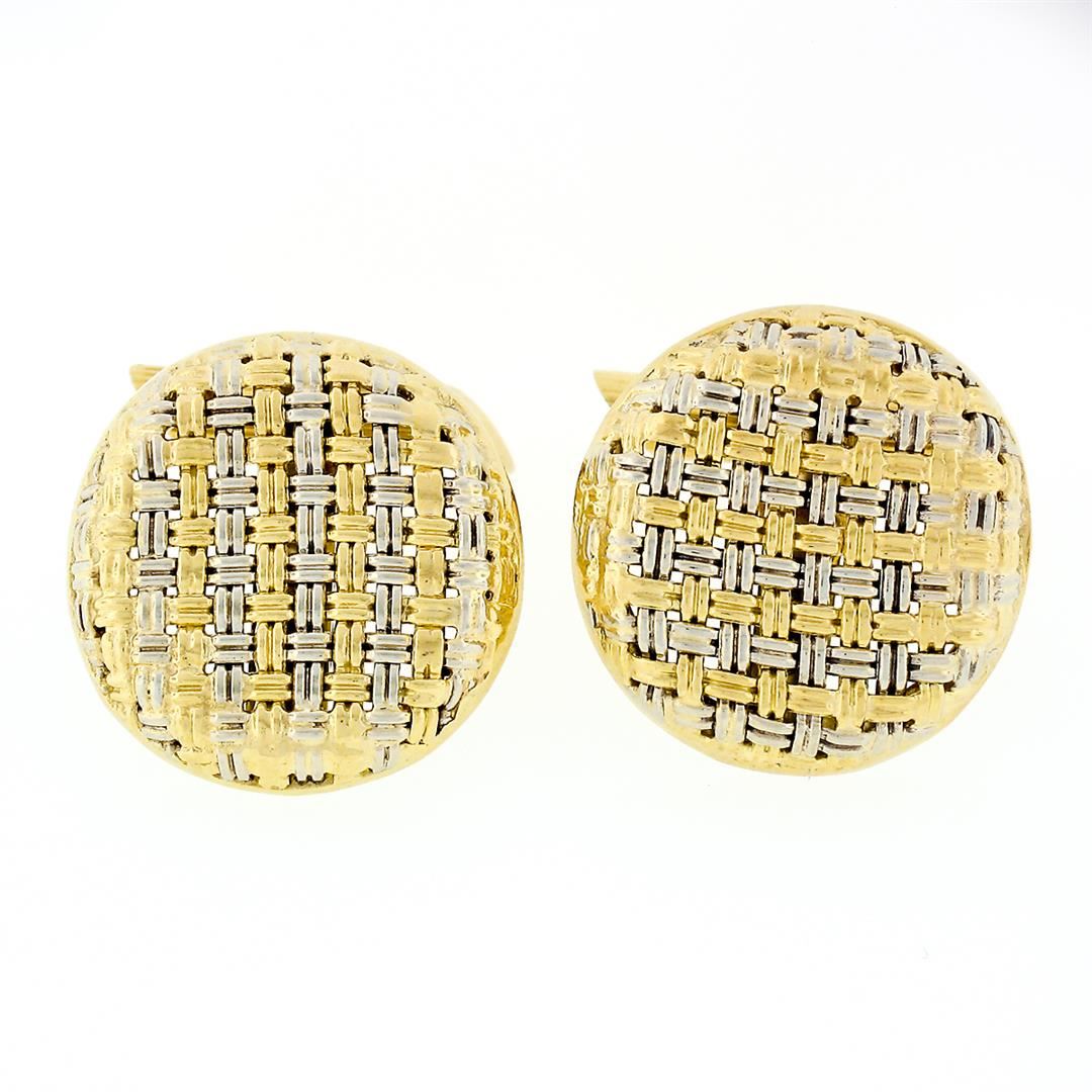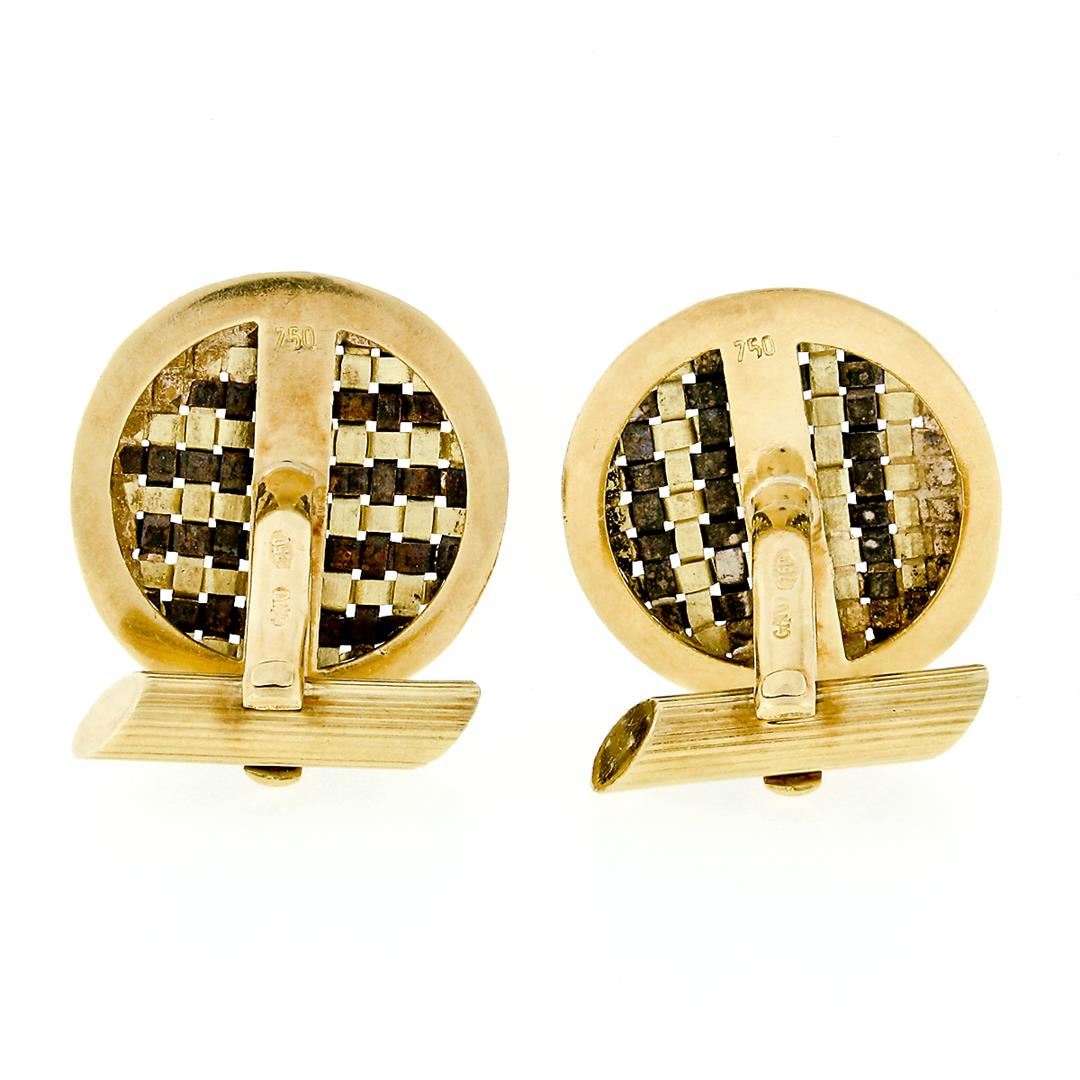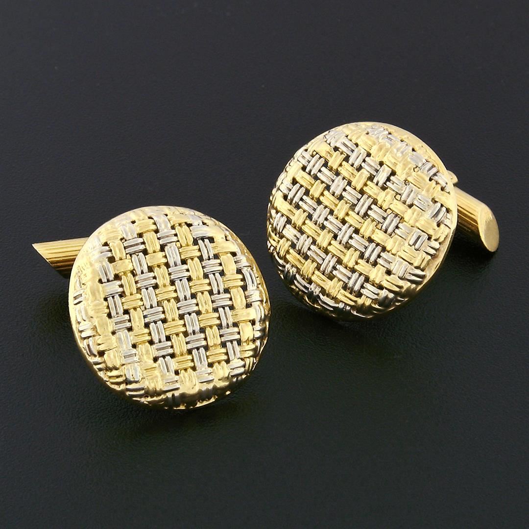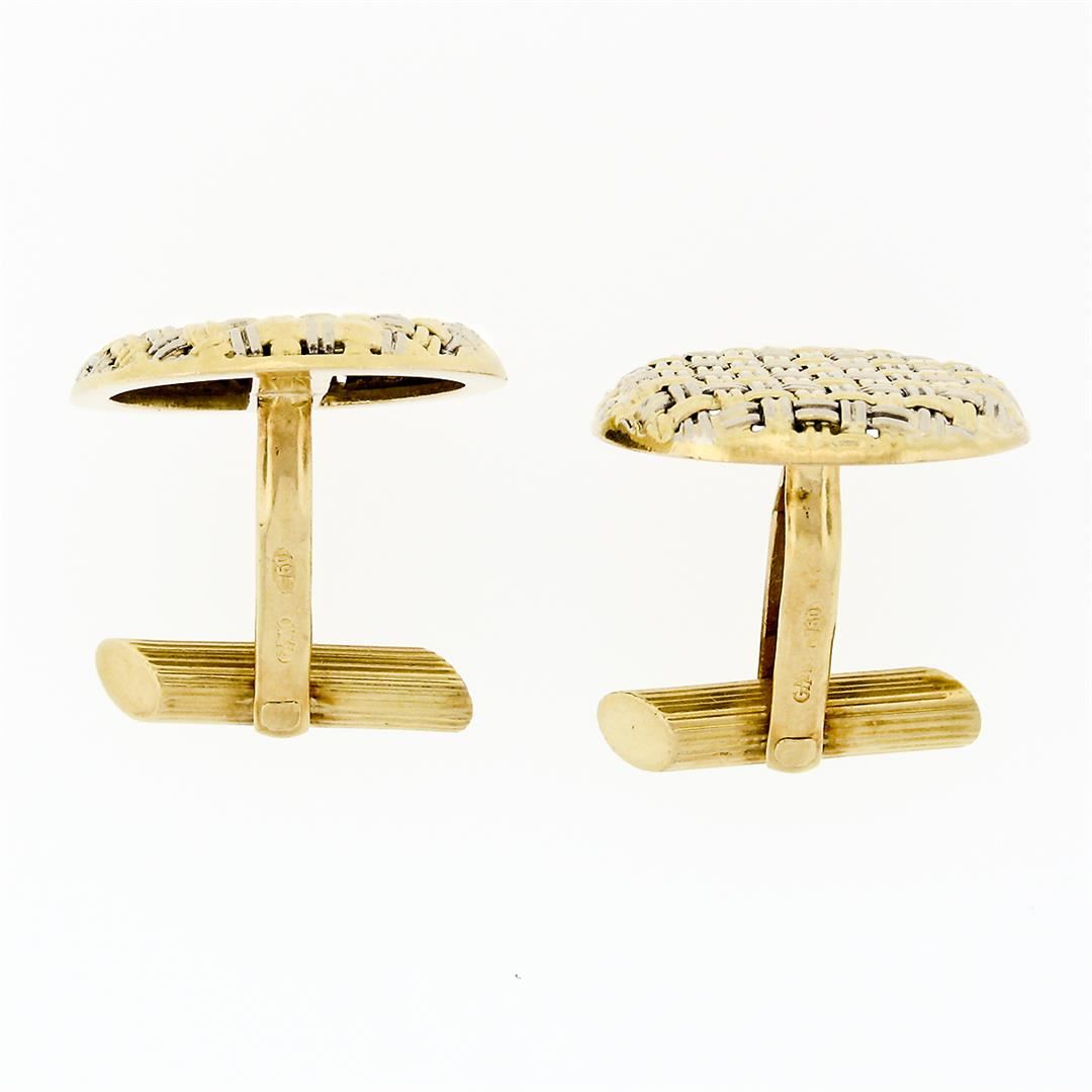 A vintage solid 18k two tone gold basket weave cufflinks. These cuff links have a swivel backs design with a clearance of 9.25mm, weigh a total of 13.33 grams, and the front panels measure 20.70mm in diameter.