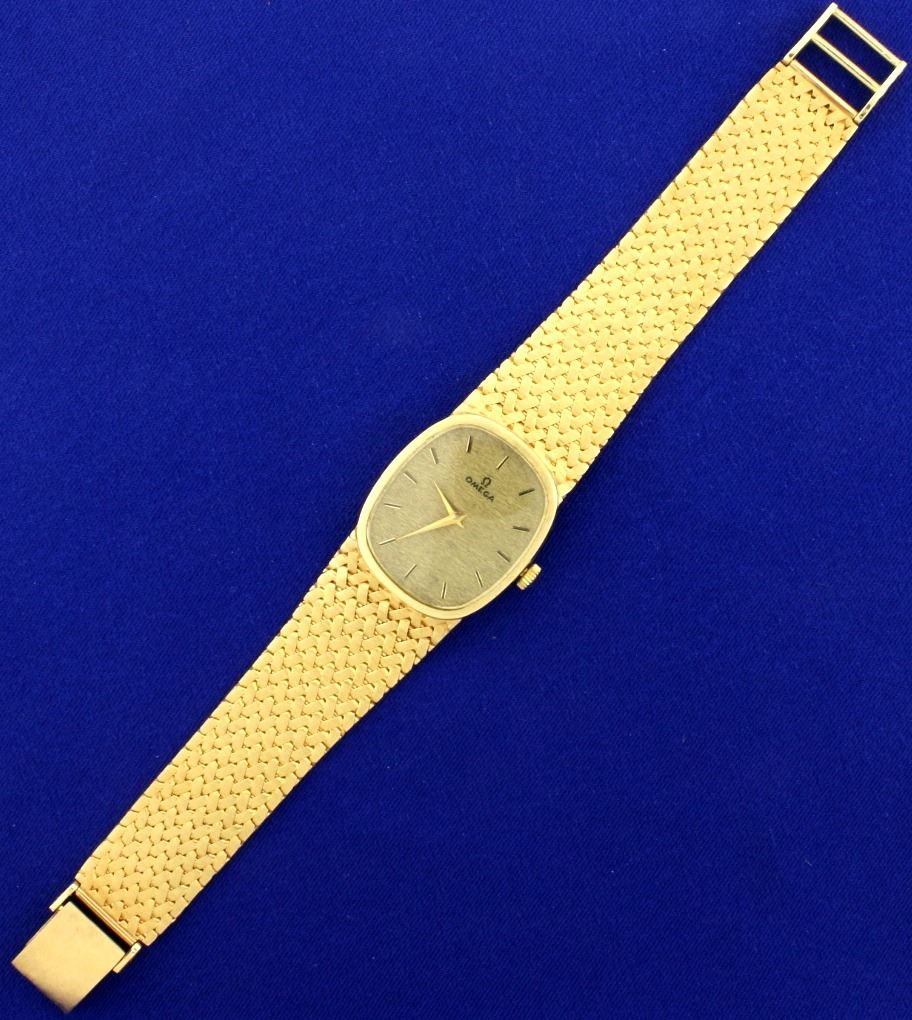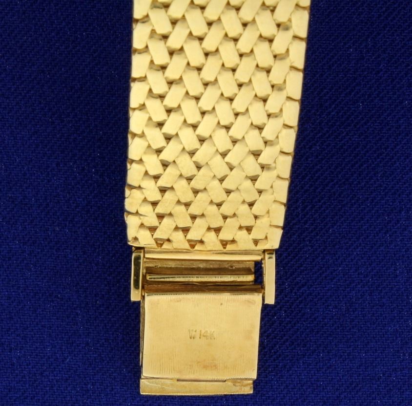 In 14k yellow gold. Wind up movement runs great and keeps perfect time. Watch is in excellent condition with no scratching on crystal and almost no scratching on case or band. 7 7/8" long. Case and band are both solid gold. 54.4g.