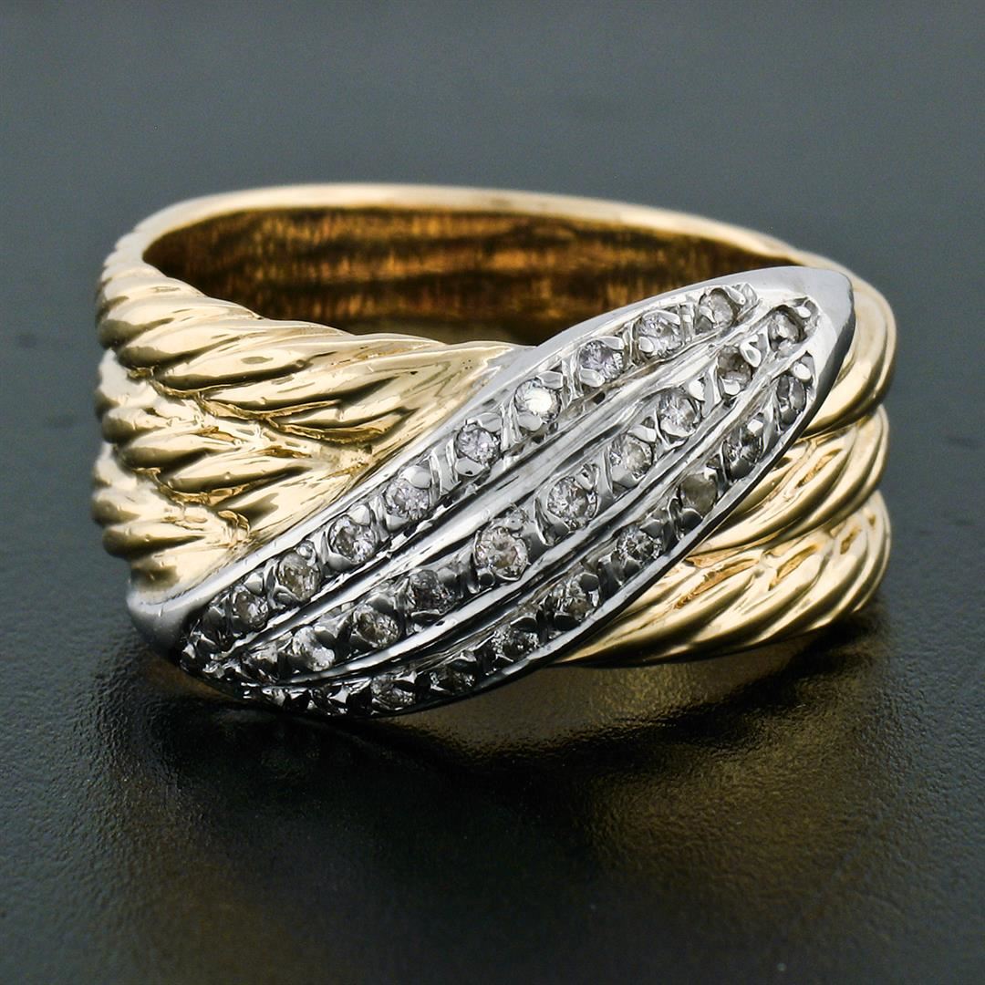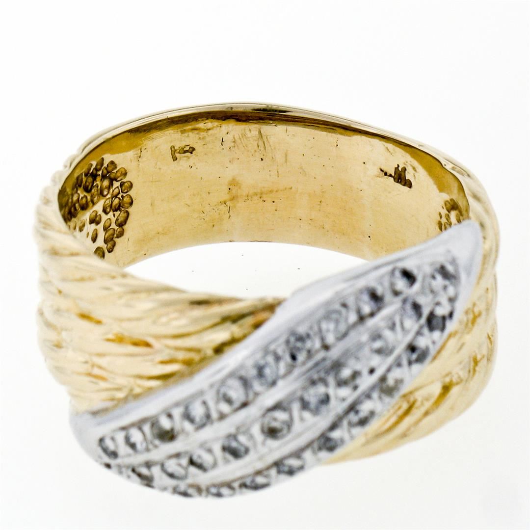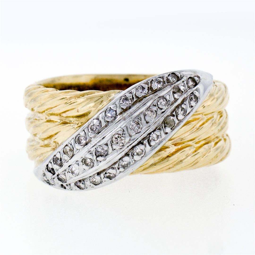 A vintage solid 14k white and yellow gold cable wide ring, with 30 round brilliant cut natural diamonds (H/I- SI1/SI2 ; 0.30ctw). The ring is size 10.5, weighs a total of 12.28 grams, and measures 13.0mm wide.