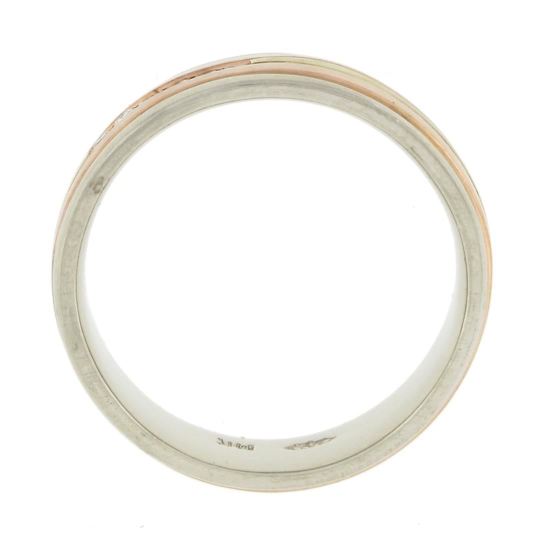 A vintage solid 14k rose, white & yellow gold ring. with 6 round brilliant cut natural diamonds (G/H - VS1/VS2 ; 0.10ctw). The ring is size 10.5, weighs a total of 9.43 grams, and measures 7.1mm wide.