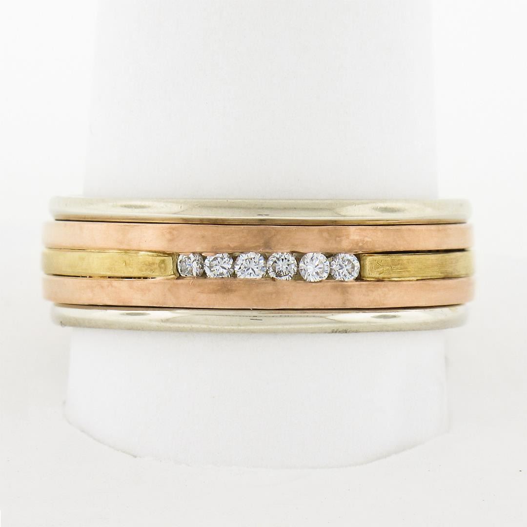 A vintage solid 14k rose, white & yellow gold ring. with 6 round brilliant cut natural diamonds (G/H - VS1/VS2 ; 0.10ctw). The ring is size 10.5, weighs a total of 9.43 grams, and measures 7.1mm wide.