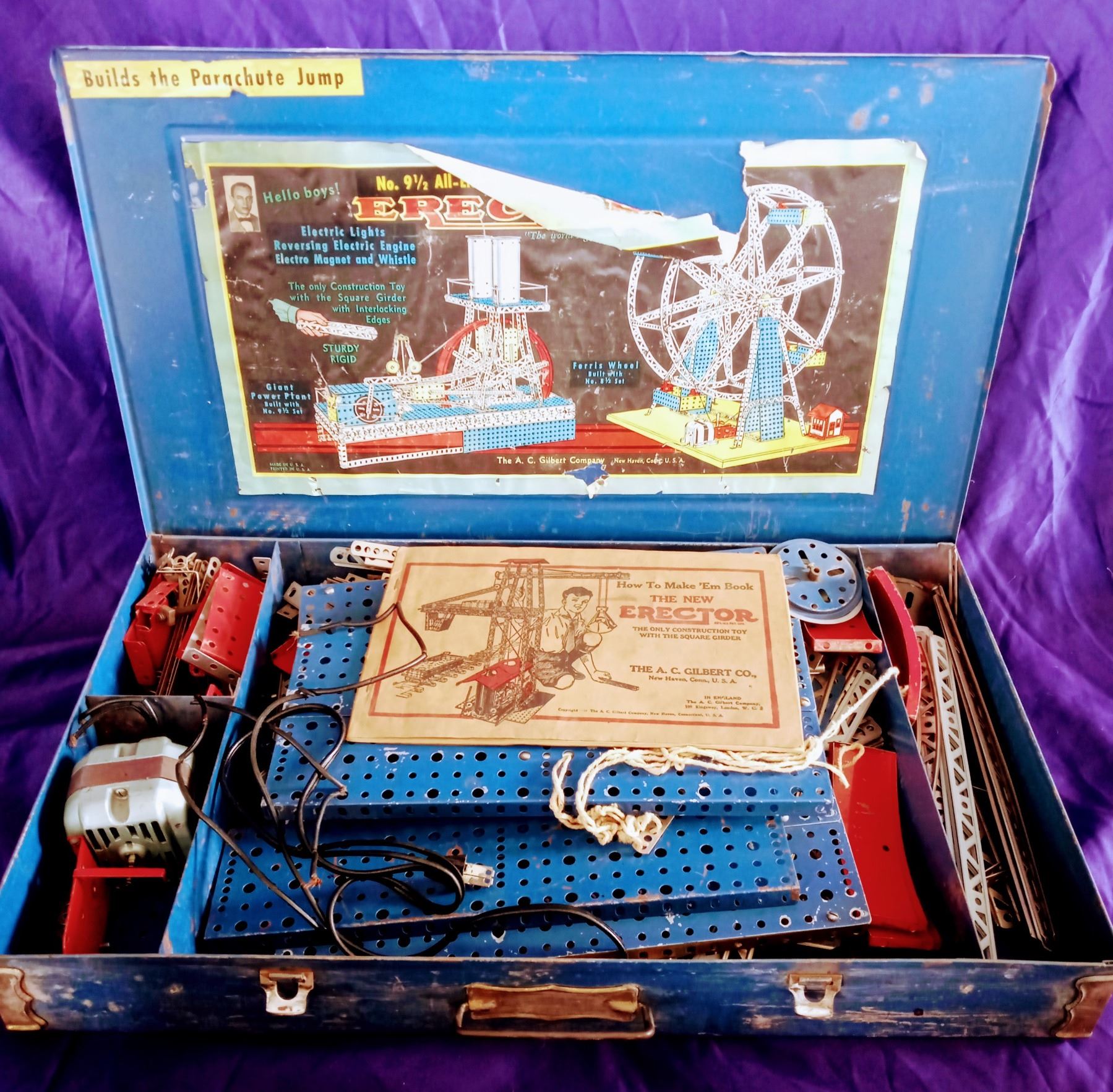 Vintage Mid Century Metal Erector Set. A No. 9 1/2 All Electric Automotive Set. The orginial case has the Original insert on the inside panel. It also comes with an instruction booklet.