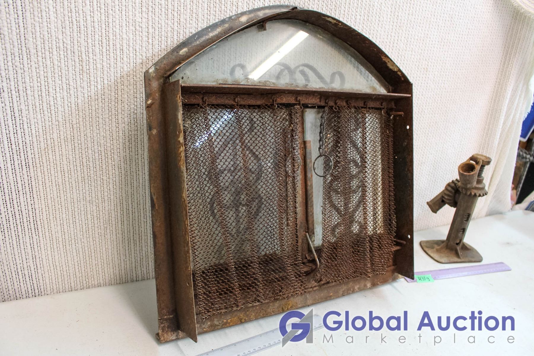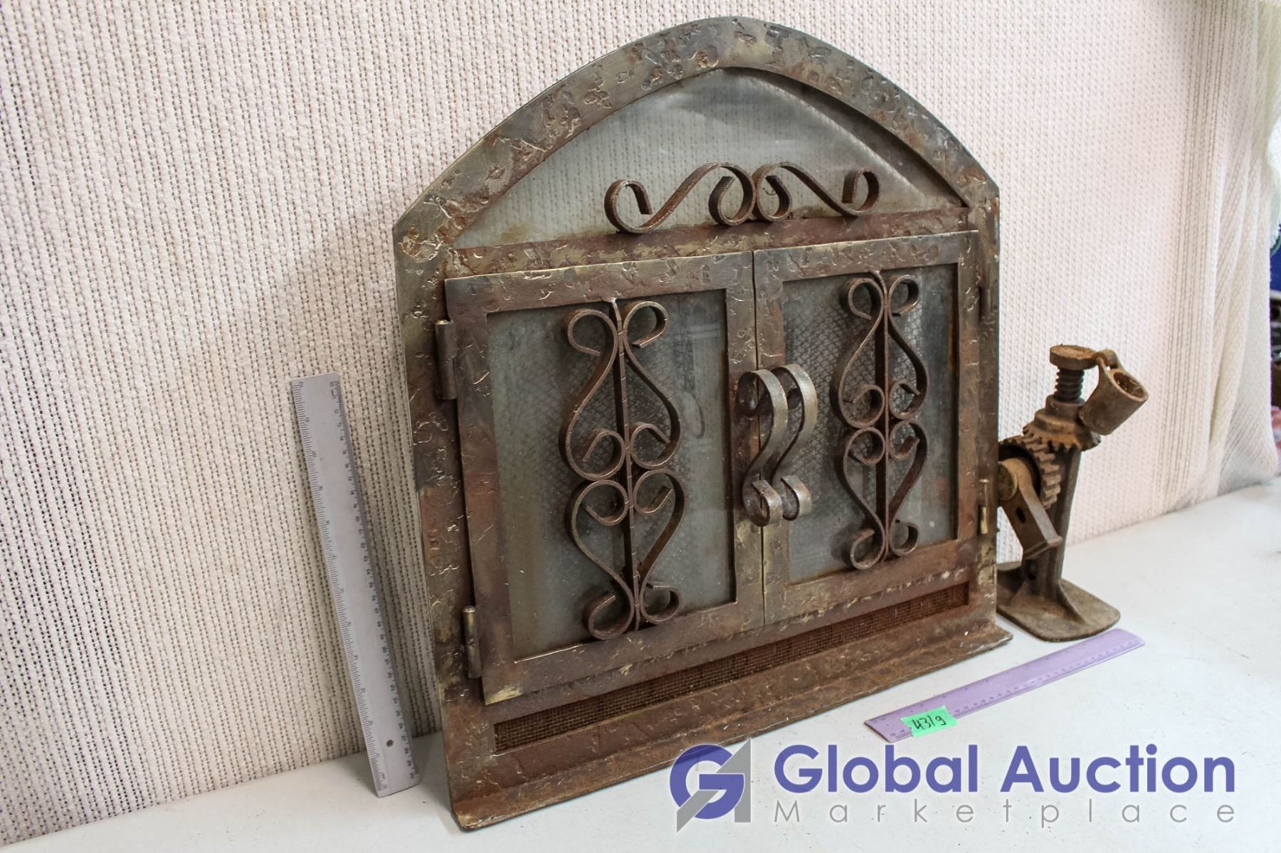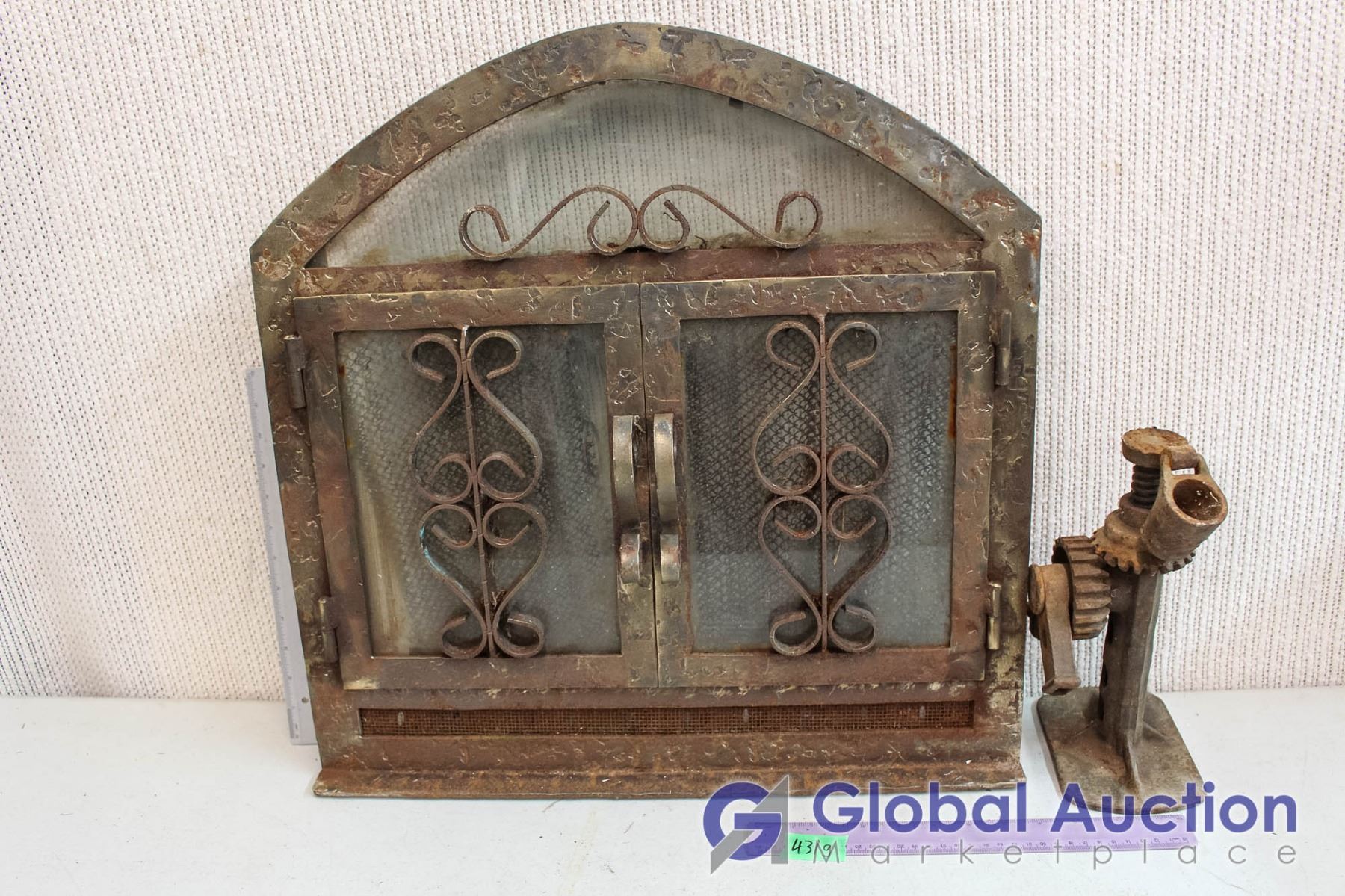 Vintage Metal/Glass Fireplace Doors in Frame with Automotive Jack
