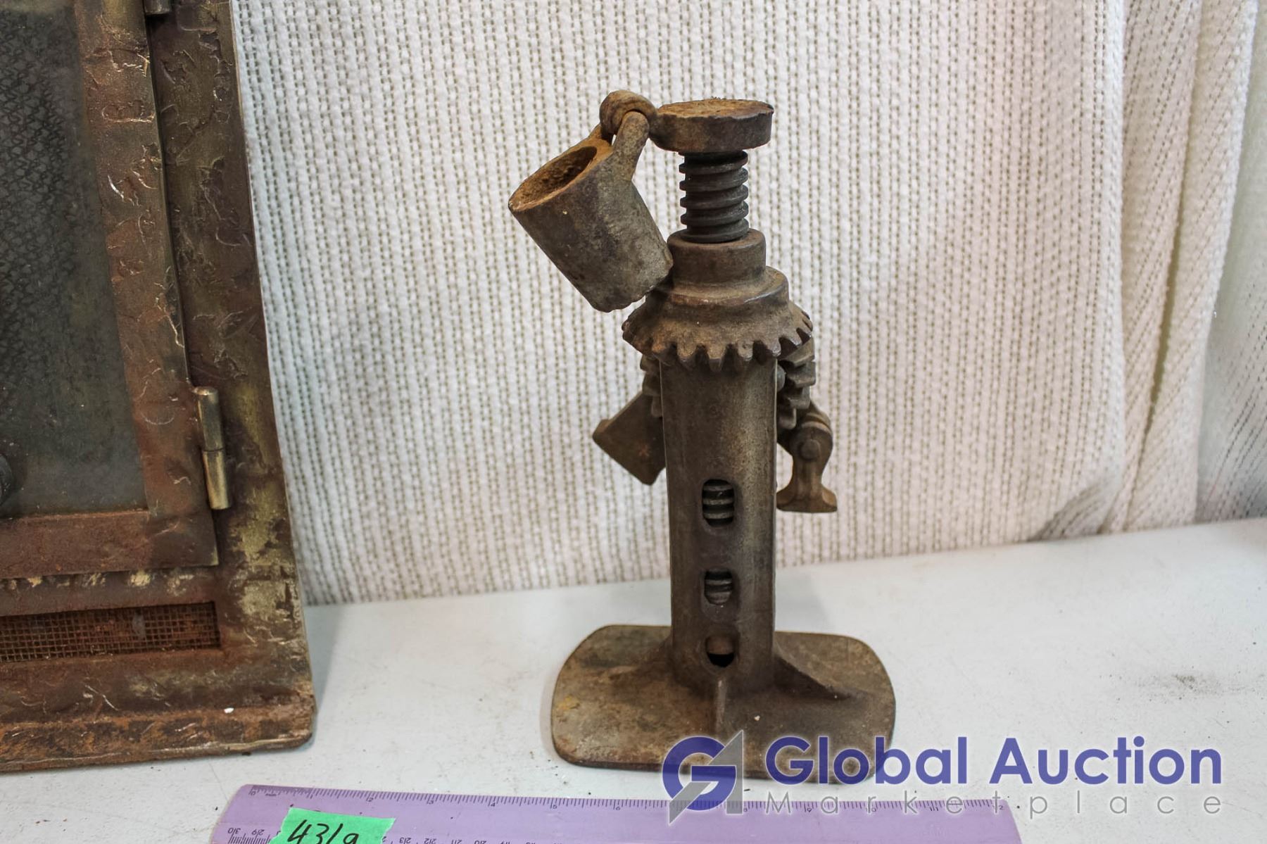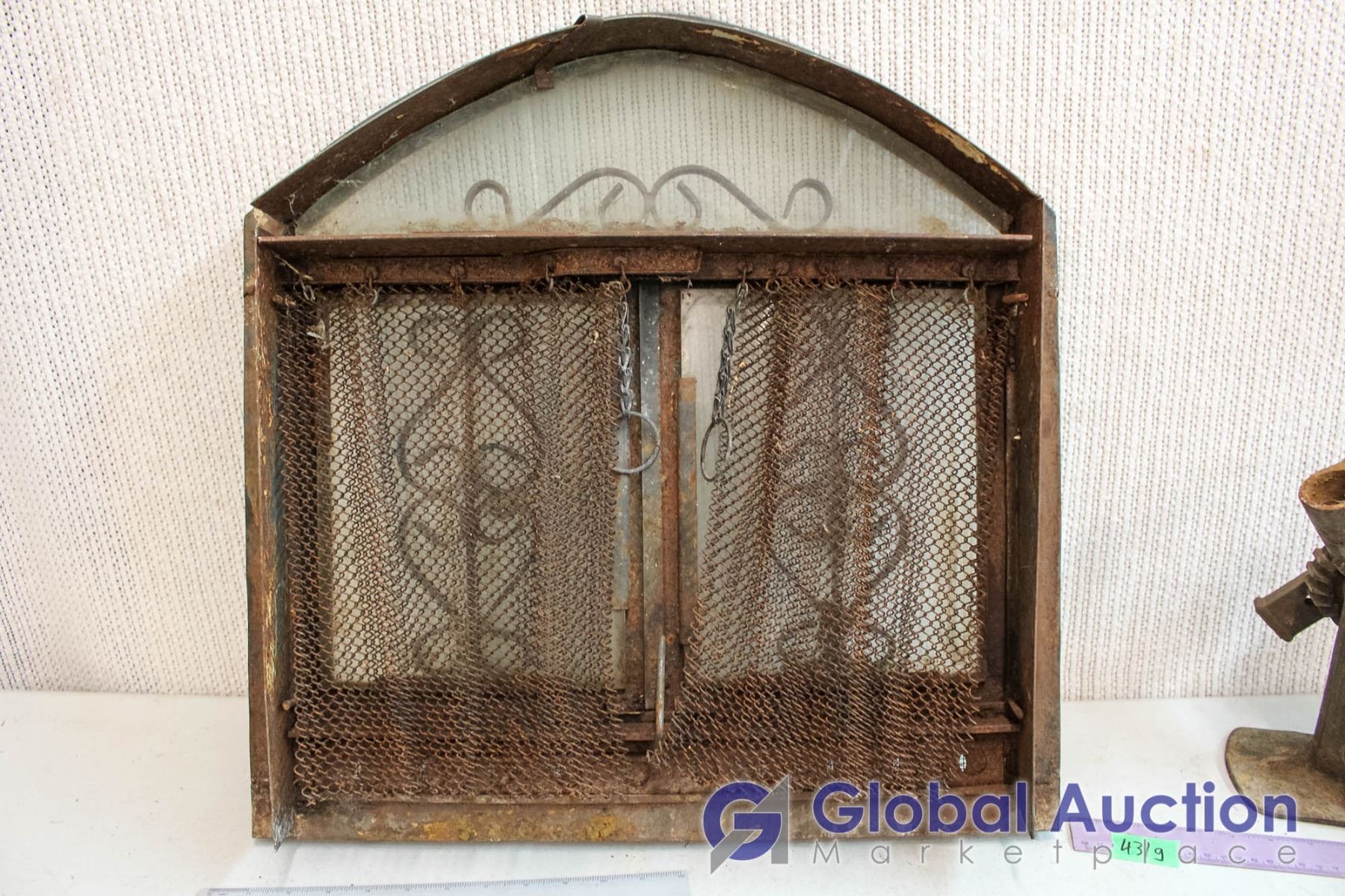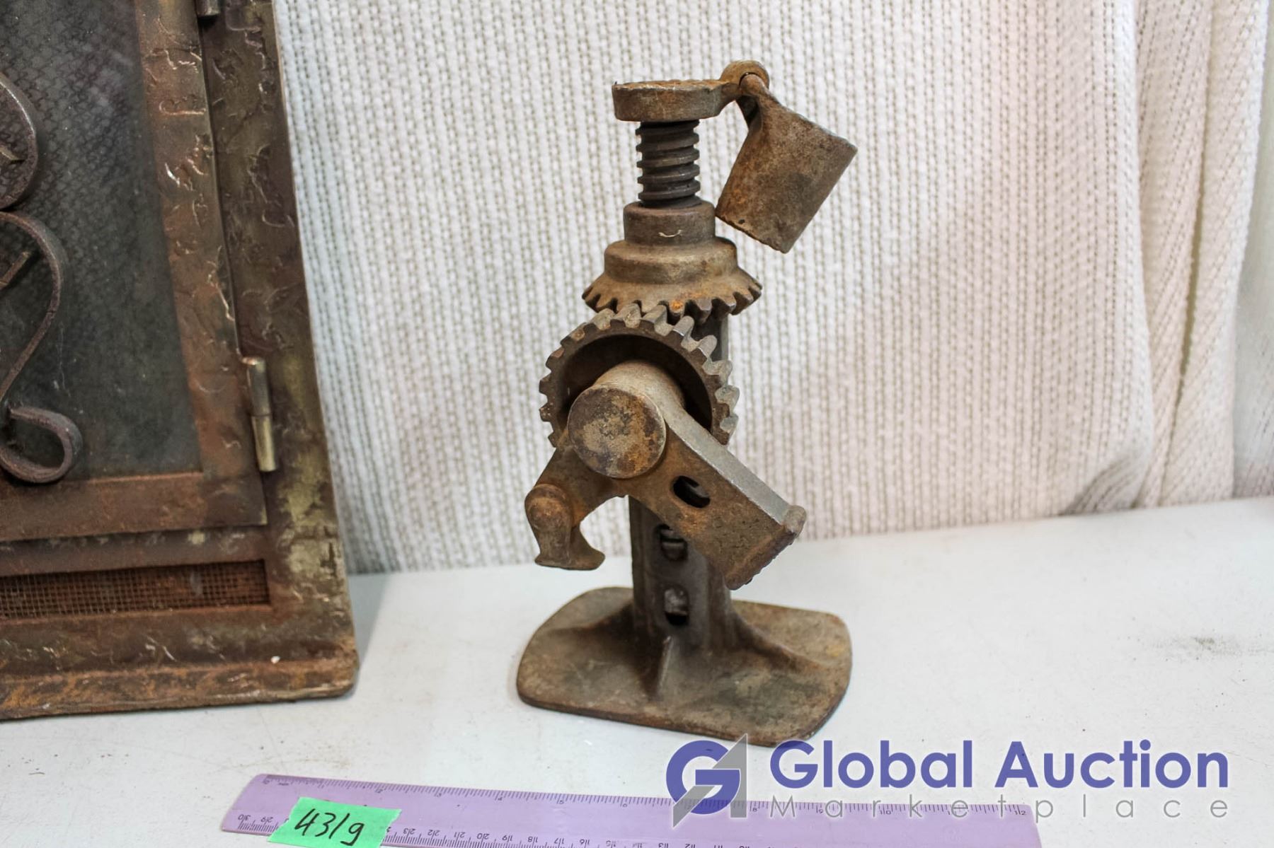 Vintage Metal/Glass Fireplace Doors in Frame with Automotive Jack