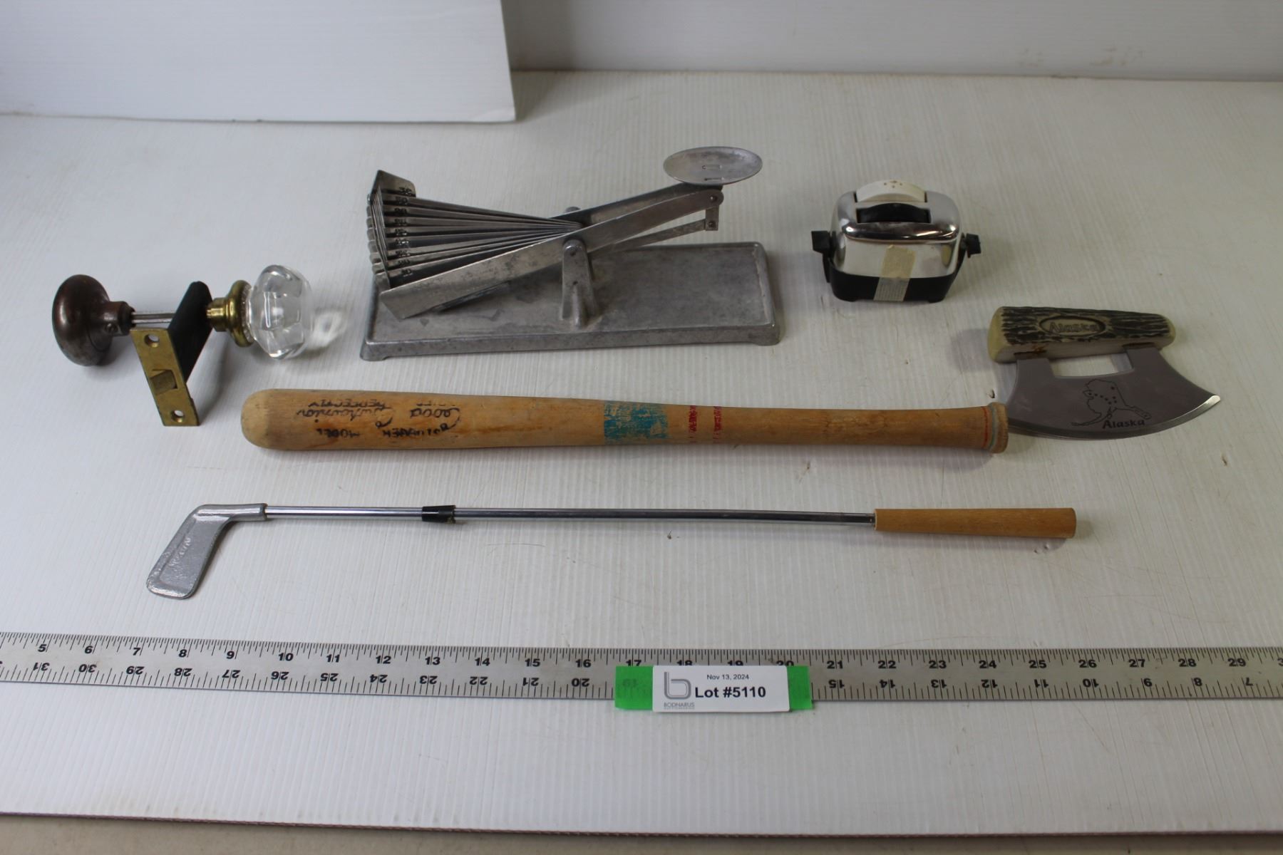 Vintage Metal Scale 10" x 3.5" x 4.5" High, Salt & Pepper Shaker Toaster, Alaska Fileting Blade, Antique Door Knob Set, Mini Golf Club & Baseball Bat