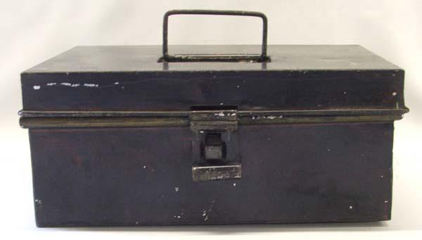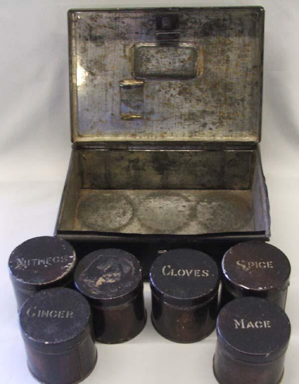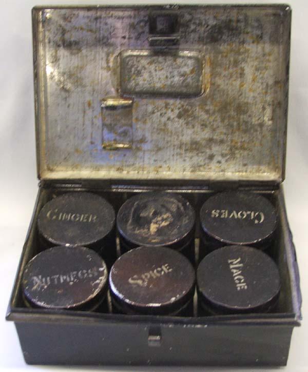 Vintage Metal Spice Box. Measures approx. 4''H x 9'' x 6 1/8''. Canisters measure approx. 2 7/8''Diameter. 1 cloves, 1 mace, 1 spice, 1 ginger and 1 nutmeg and 1 unmarked. Buyers Pay Actual Shipping and Handling Charges(see terms and conditions for more information).