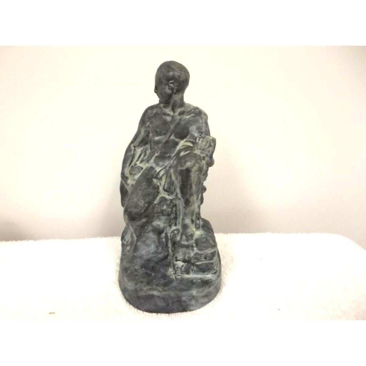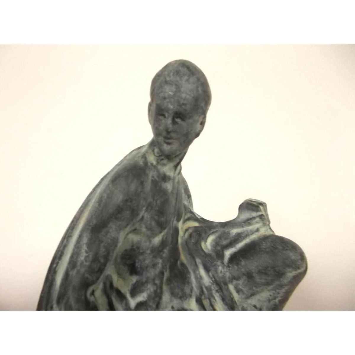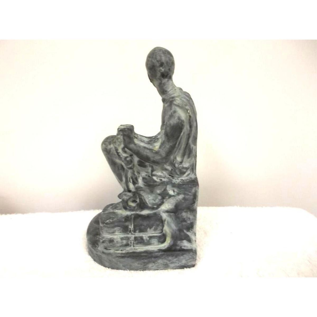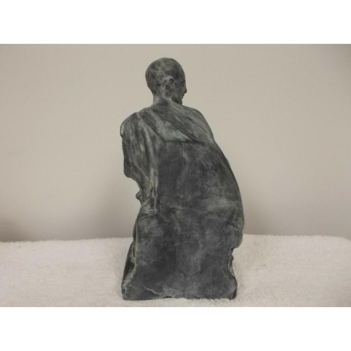 Vintage statue, bookend, depicting a classical Roman man. Hollow, open bottom, metal with green patina. 7 1/2" H X 4 3/8" W X 3 3/4" D.