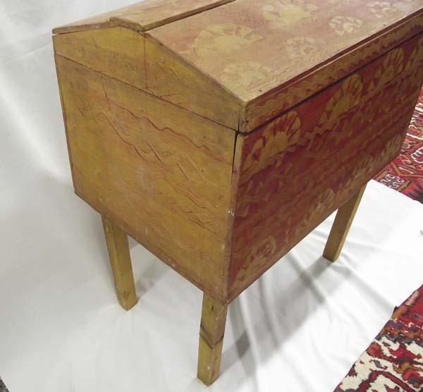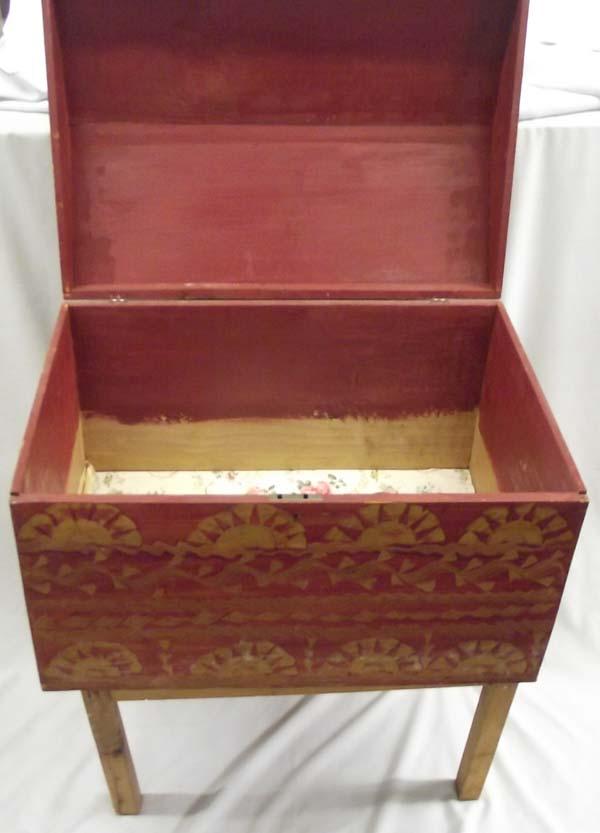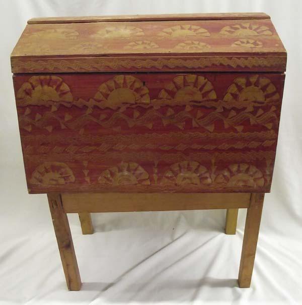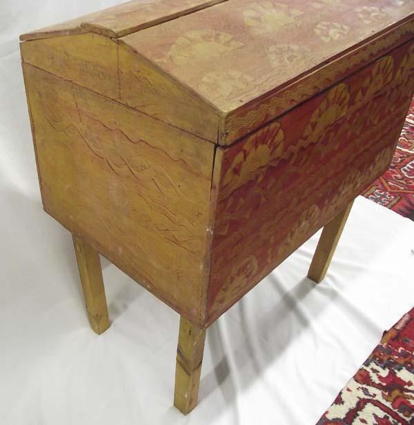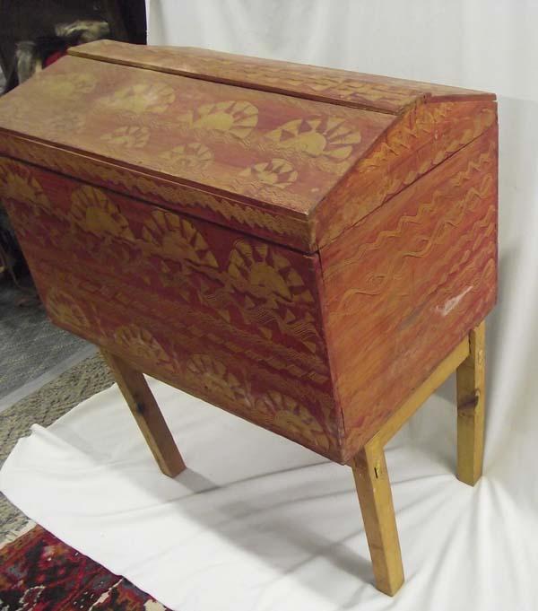 Vintage Mexican Blanket Trunk on stand, lightly carved designs in the red paint, trunk measures approx. 16 5/8''H x 25.75''L x 17.75''W and stand measures approx. 25''L x 16''H x 14''W. MUST BE PICKED UP