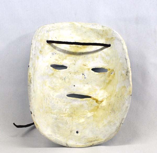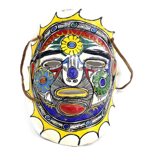 Vintage Mexican Clay Mask, leather tie for hanging, measures 8'' x 9'', beautifully crafted and painted in vibrant colors
