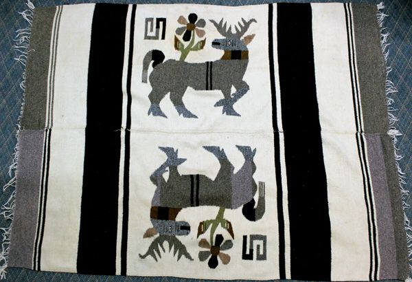 Vintage Mexican Deer Design Wool Rug. This textile has a mirror image design of deer and a flower. It has good selvages, some wear on the fringed sides, and normal wear for age with some staining. This Textile piece was woven on two looms and then stitched together, measures 74.5''L x 54.5''W