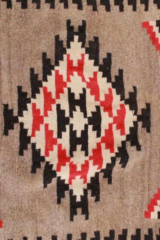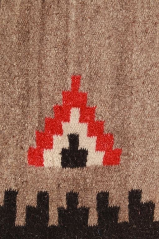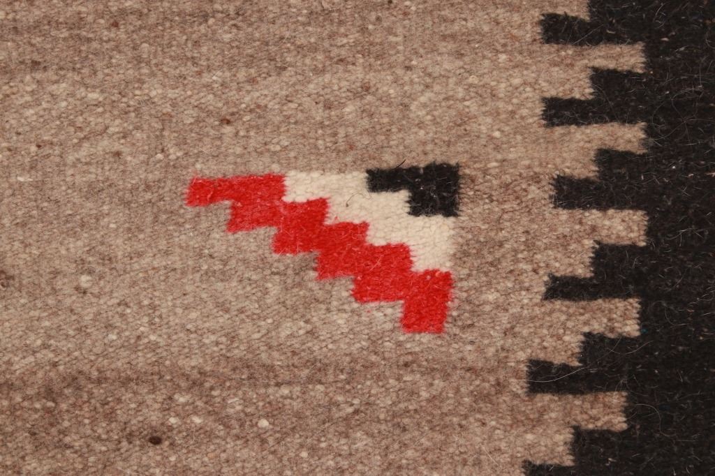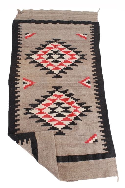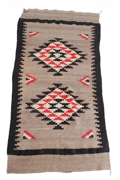 Featured in this lot is this vintage Mexican indigenous Two Grey Hills style blanket. The blanket shows a wonderfully and professionally crafted wool construction that shows traditional Mexican weaving with a Two Grey Hills style with a grey field and black medallion that shows stepped red throughout. The condition of this Mexican rug is good with no obvious signs of damage and shows good overall condition. The measurements of this rug is 79 1/2" x 41".