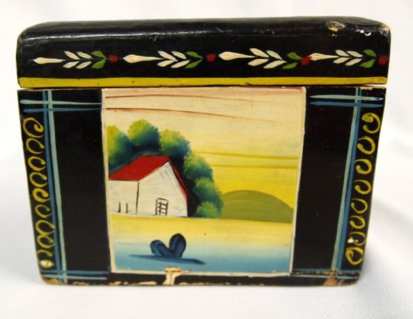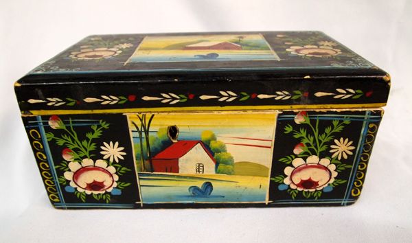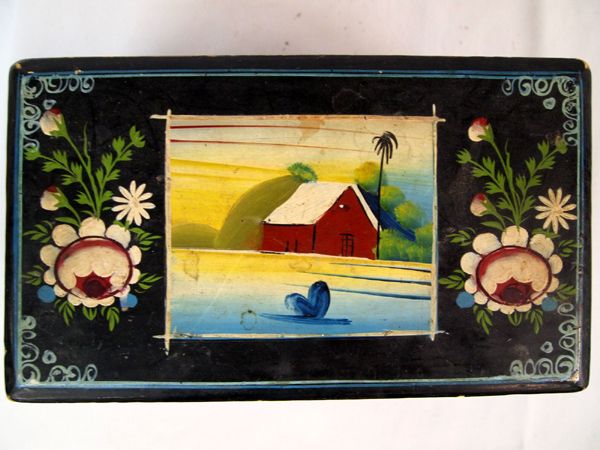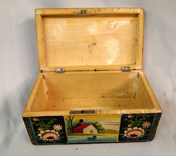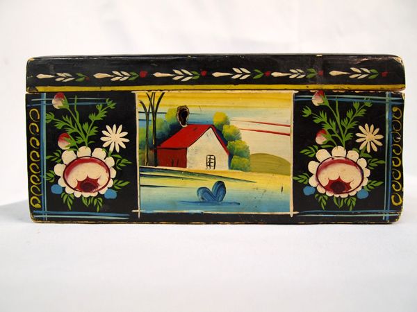 Vintage Mexican Laquer Ware Hand-Painted Box. Likely used for trinkets. Measures 3 3/4'' high, 7 1/2'' long and 4.5'' wide. Nice early piece, likely from the 1920's-30's.