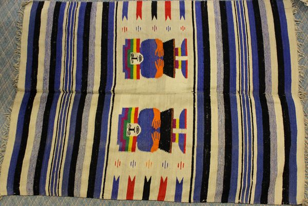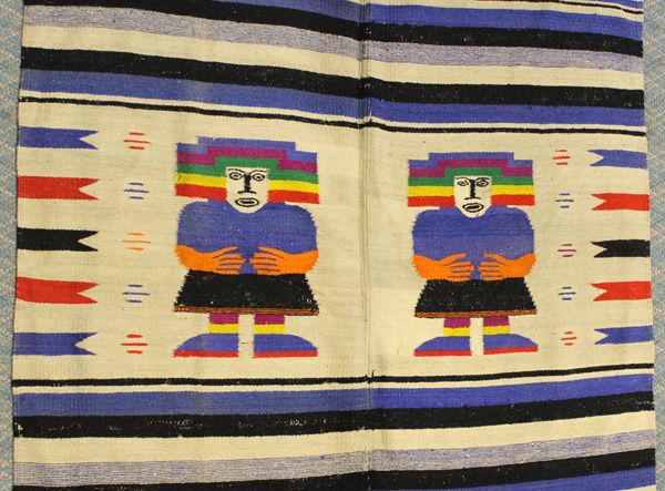 Vintage Mexican Pictorial Wool Textile. This rug has a mirror image design of Man. It has good selvages, some wear on the fringed sides, and normal wear for age. This Textile piece was woven on two looms and then stitched together, measures 72''L x 52''W