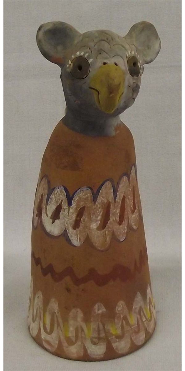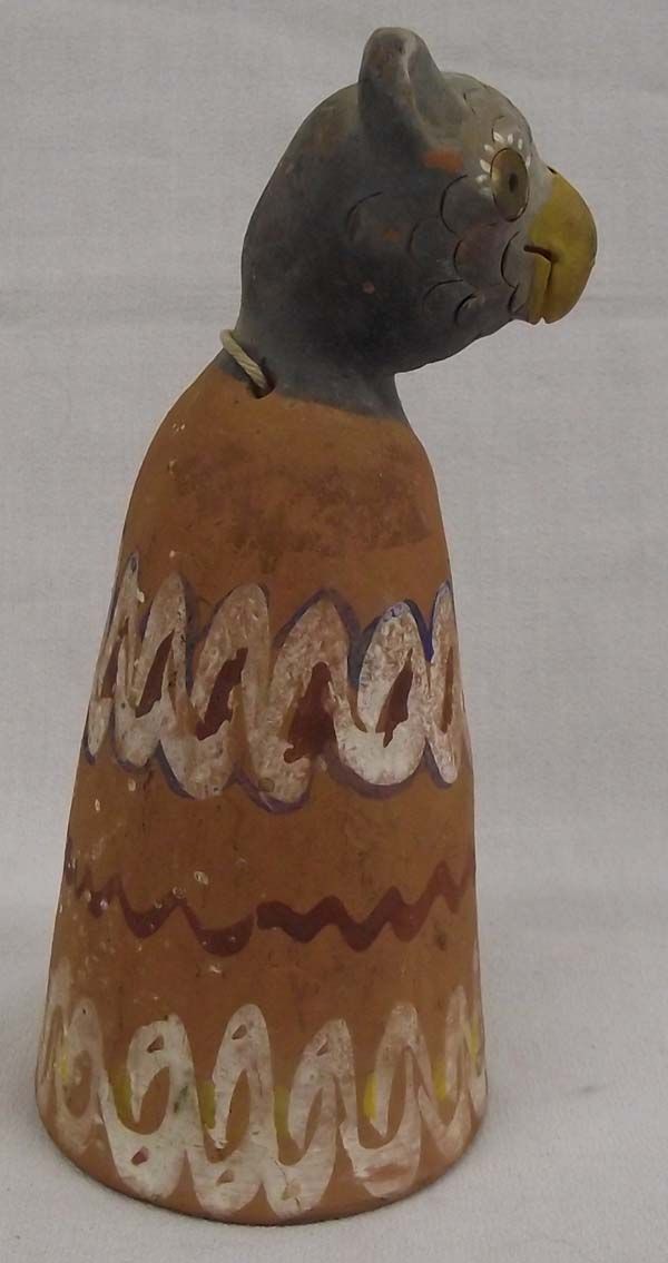 Vintage Mexican Pottery Owl Figure Bell. Charming hand painted bell with a handle shaped in the figure of an owl. Measures 6.25''Hx3''W.