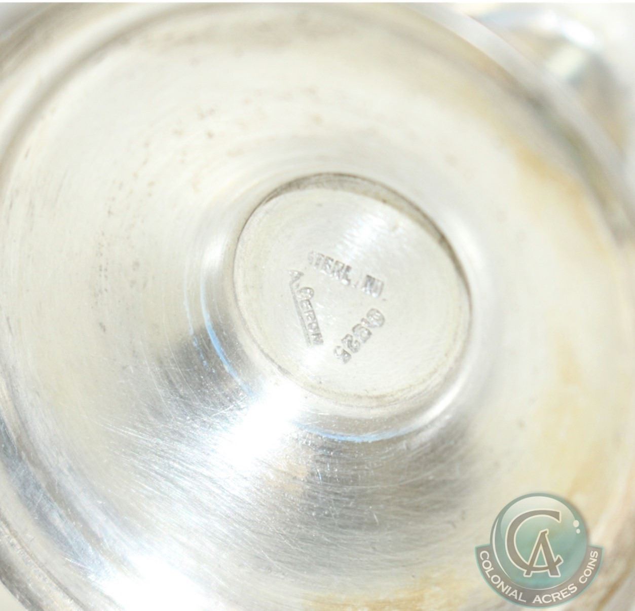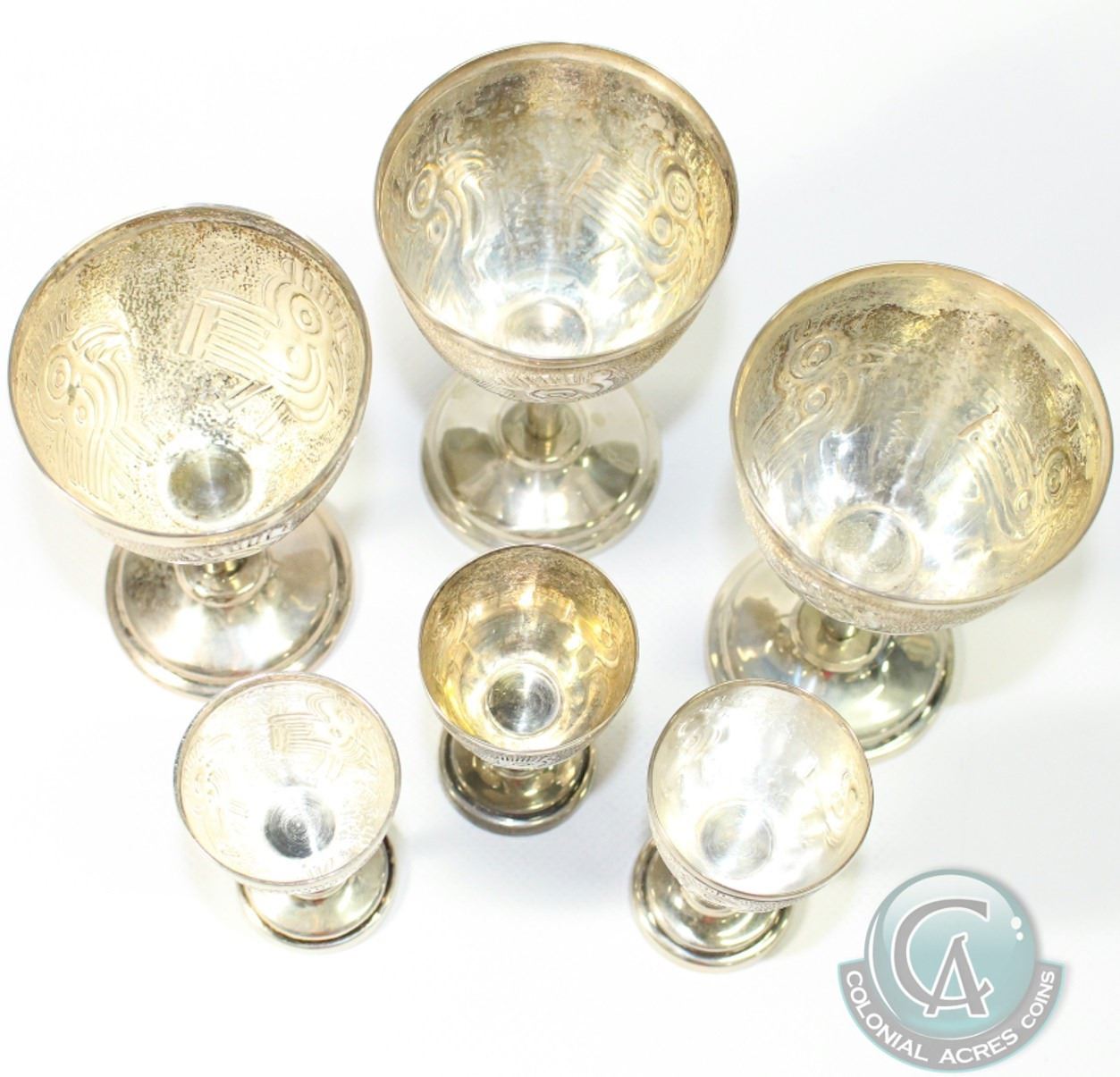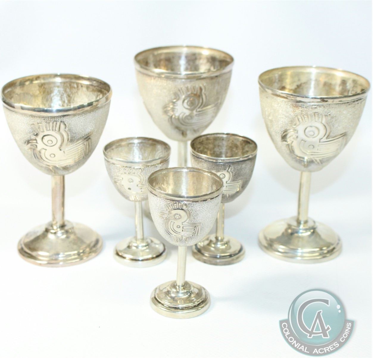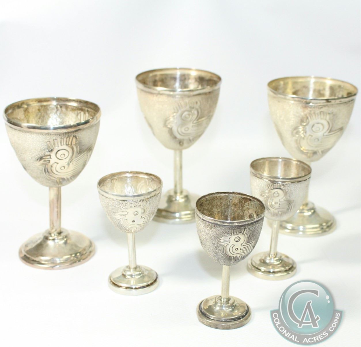 Vintage Mexico A. Ceron Sterling Silver Stemmed Cordial Cups. Each Cup Contains the ancient Aztec Bird Motif highlighted by a textured background. The Larger Cups measure 4 1/4" in height with a diameter of 2 1/2", while the smaller cups measure just under 3" in height with a diameter of 1 1/2".