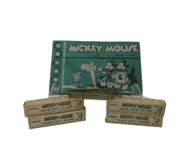 Vintage collection of four Mickey Mouse Safe-Toy animation negatives for use with the Mickey Mouse safe-toy cinemas (2 of #51- Mickey's harp and 2 of #58 Mickey Twists the lions tail), and a Mickey Mouse vintage Dixon pencil case with vintage pencils, crayons and a ruler.