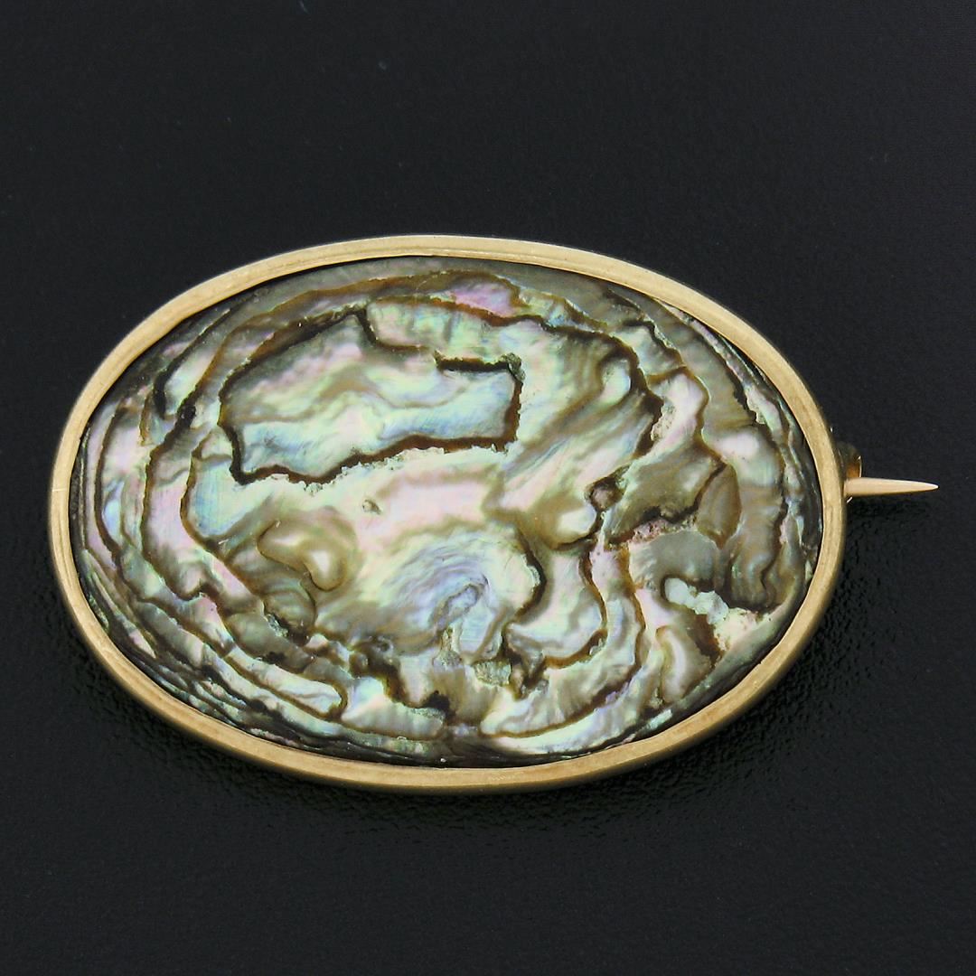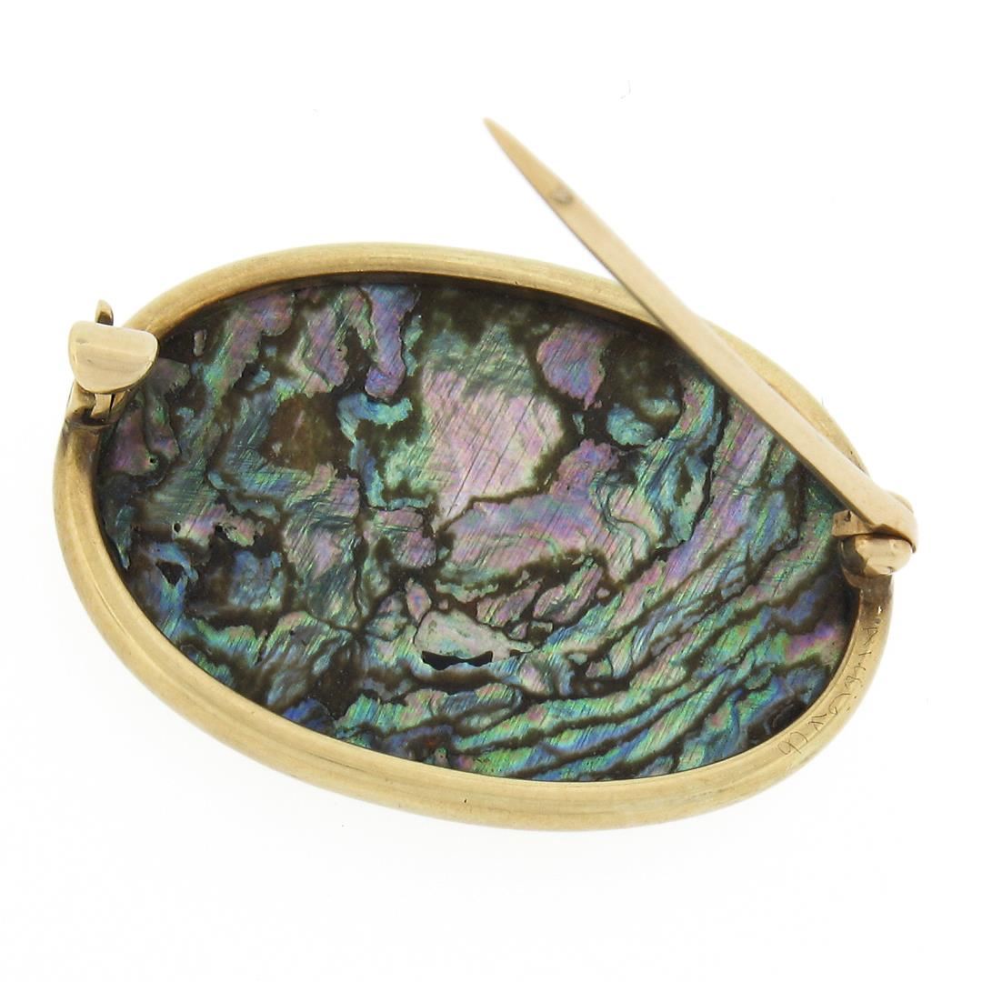 A vintage solid 14k yellow gold brooch, with 1 oval cut Iridescent Abalone Shell (25.6x17.2mm). Measures 27.7x21.8mm and weighs a total of 4.32 grams.
