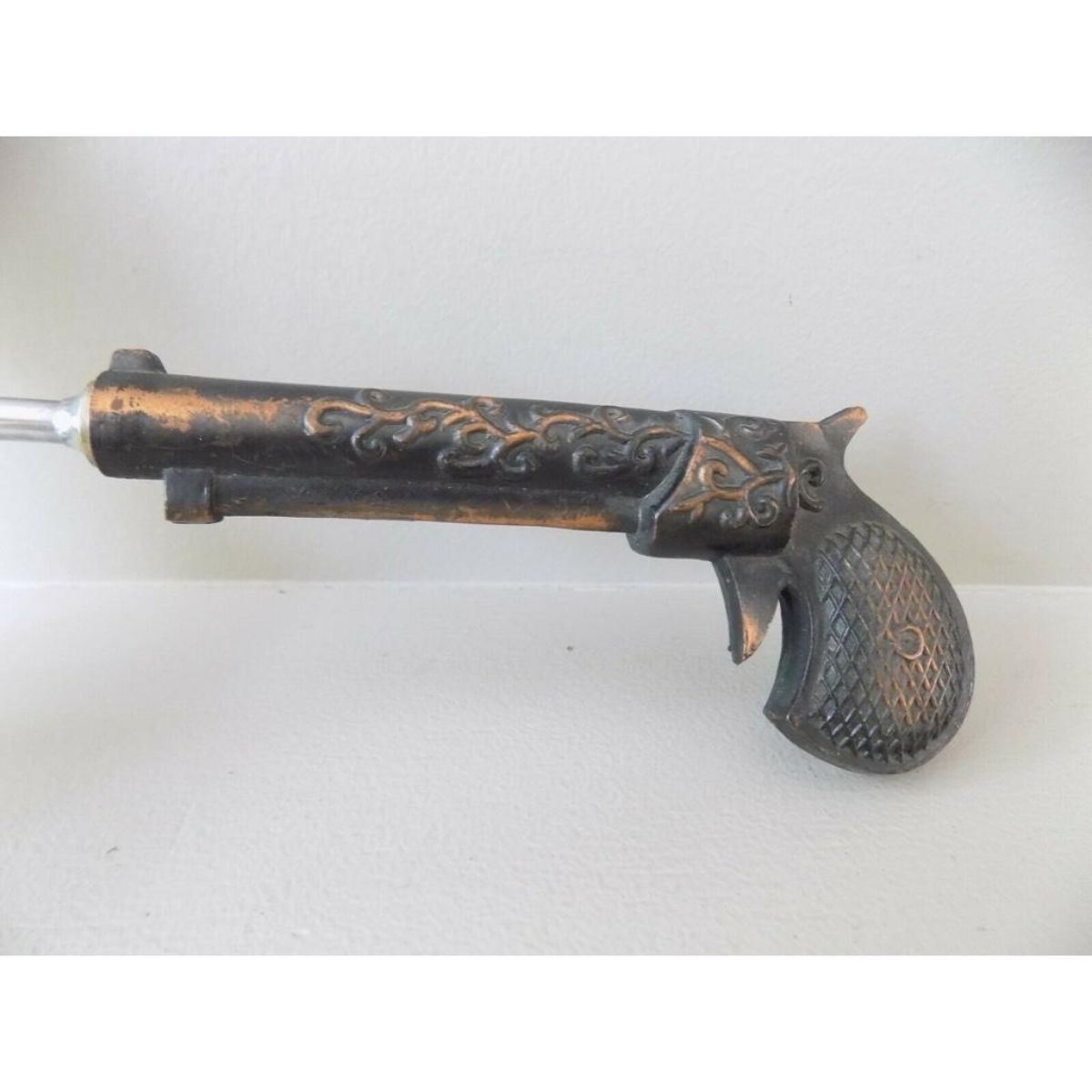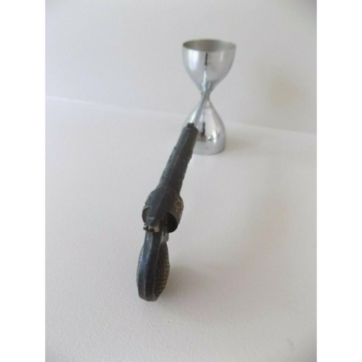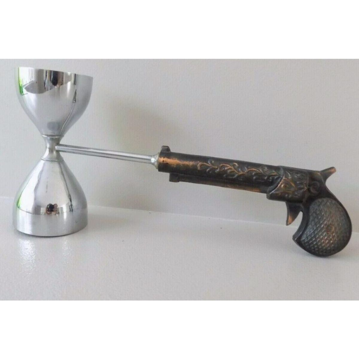 Vintage Mid-century gentlemen's chrome & metal cocktail bar jigger tool, in the form of an antique gun, for a gun collector or arms dealer. 3 3/4" X 8". In good but used condition.