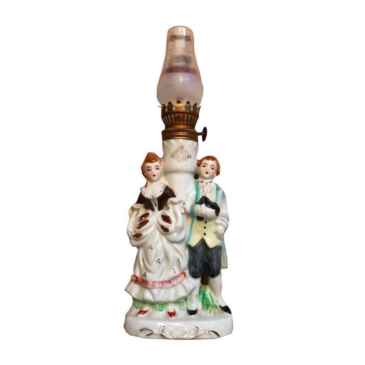 Vintage mid-century porcelain figural oil lamp, with frosted glass hurricane shade, in the form of a Colonial couple. Nasco Del Coronado Japan sticker affixed to the bottom. 10 1/2" H X 3 1/2" W.